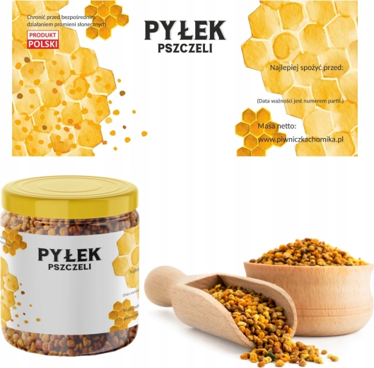 Te samoprzylepne etykiety są przeznaczone do słoików lub opakowań z pyłkiem pszczelim. Zapewniają wystarczająco dużo miejsca na kluczowe informacje, takie jak nazwa produktu, data przydatności do spożycia oraz ewentualnie numer partii. Dzięki przejrzystemu formatowi pomagają poprawić prezentację wyrobu i nadają mu profesjonalny wygląd.