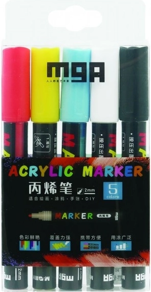 Opakowanie zawiera 5 różnych kolorów, które są idealne do rozmaitych technik artystycznych. Możesz polegać na szybkoschnących właściwościach i wodoodporności po wyschnięciu. Wszystko to w praktycznym pudełku o wymiarach 9 x 18 x 2 cm.