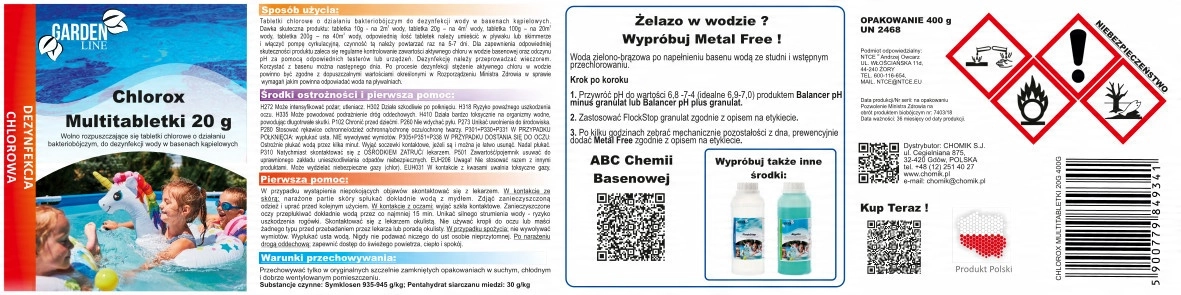 Utrzymuj wodę w basenie doskonale czystą i higieniczną dzięki tabletkom CHLOROX 20 g w opakowaniu 400 g. Te multitabletki zapewniają skuteczną dezynfekcję, ograniczają wzrost glonów i pomagają utrzymać wodę krystalicznie czystą. Dzięki praktycznej formie 20 g dozowanie jest łatwe i precyzyjne, aplikacja odbywa się przez pływak lub skimmer, a działanie trwa 5–7 dni.