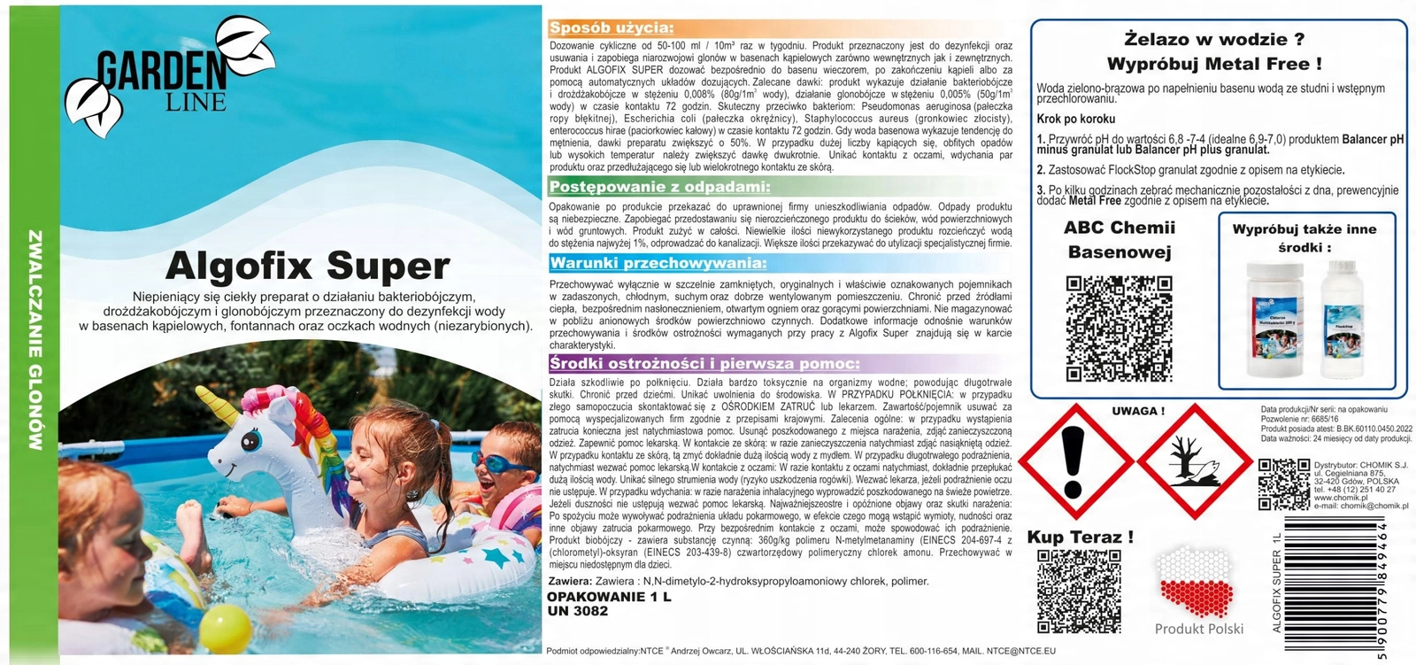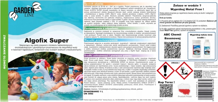 Algofix Super to nowoczesny, niepieniący płynny preparat do kompleksowej dezynfekcji wody basenowej. Skutecznie zwalcza glony, bakterie i drożdże, utrzymuje wodę kryształowo czystą i bezpieczną w basenach zewnętrznych i wewnętrznych, fontannach oraz niezarybionych oczkach ogrodowych. Idealny również przy wysokich temperaturach i intensywnym użytkowaniu bez tworzenia piany.