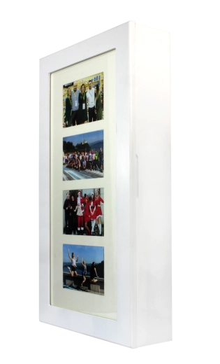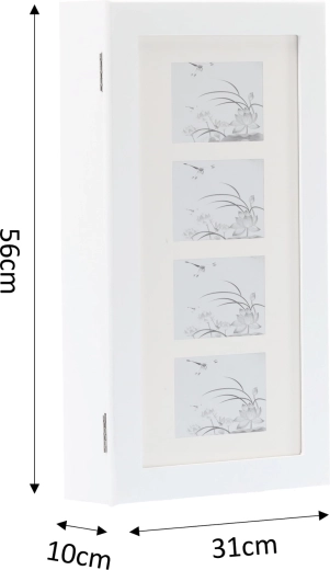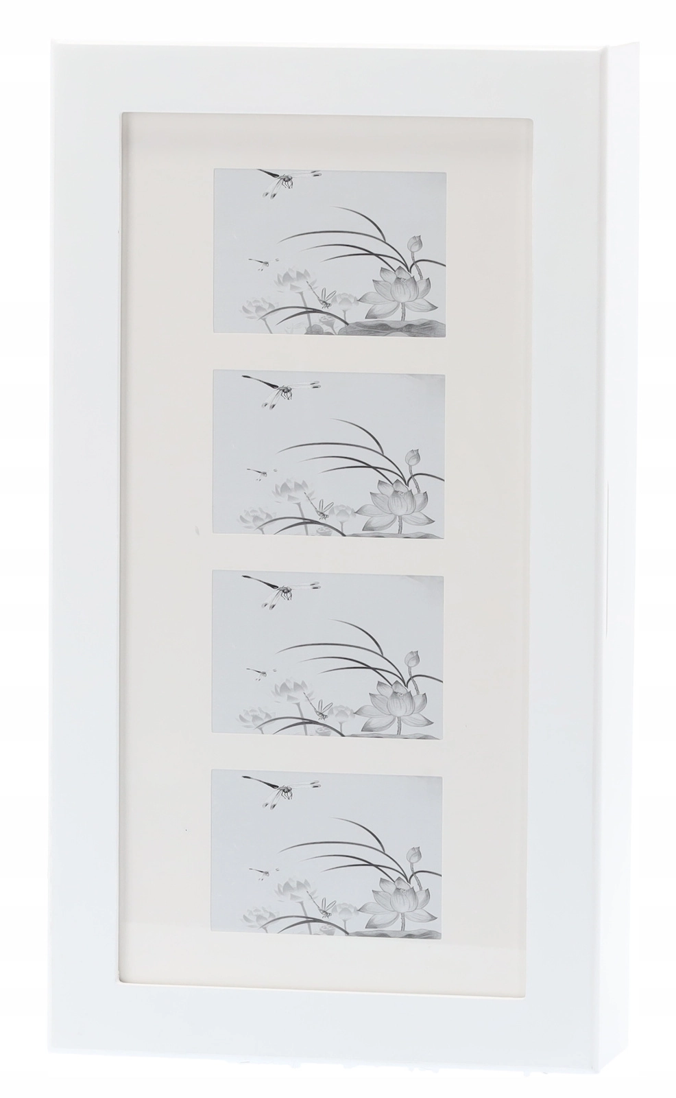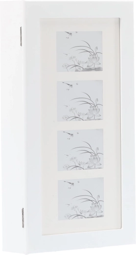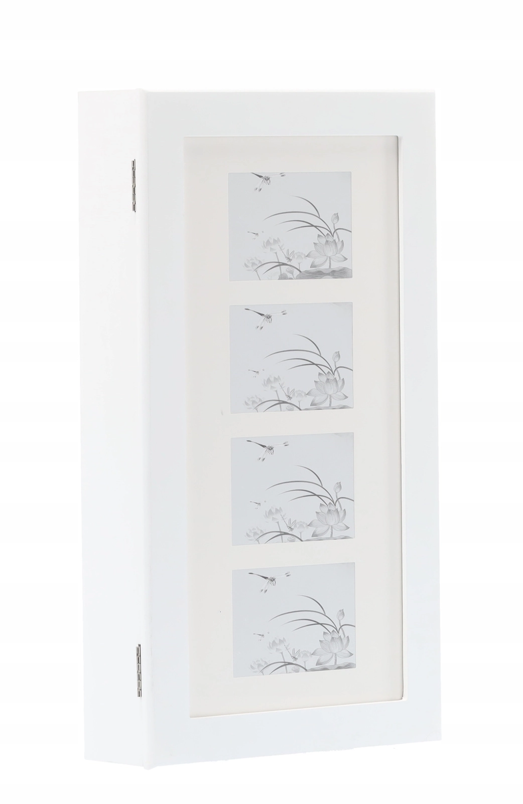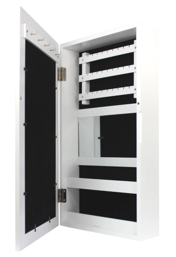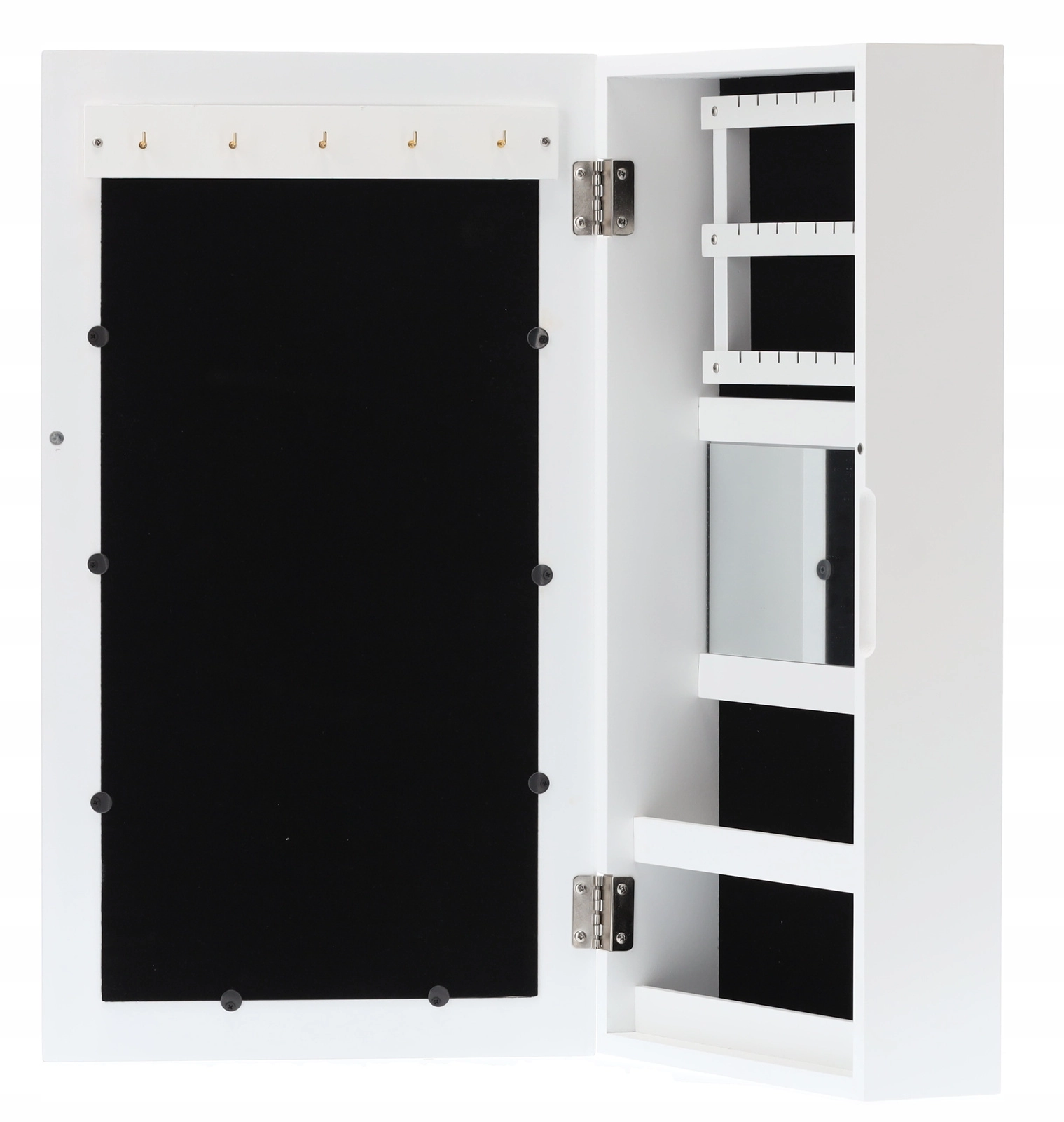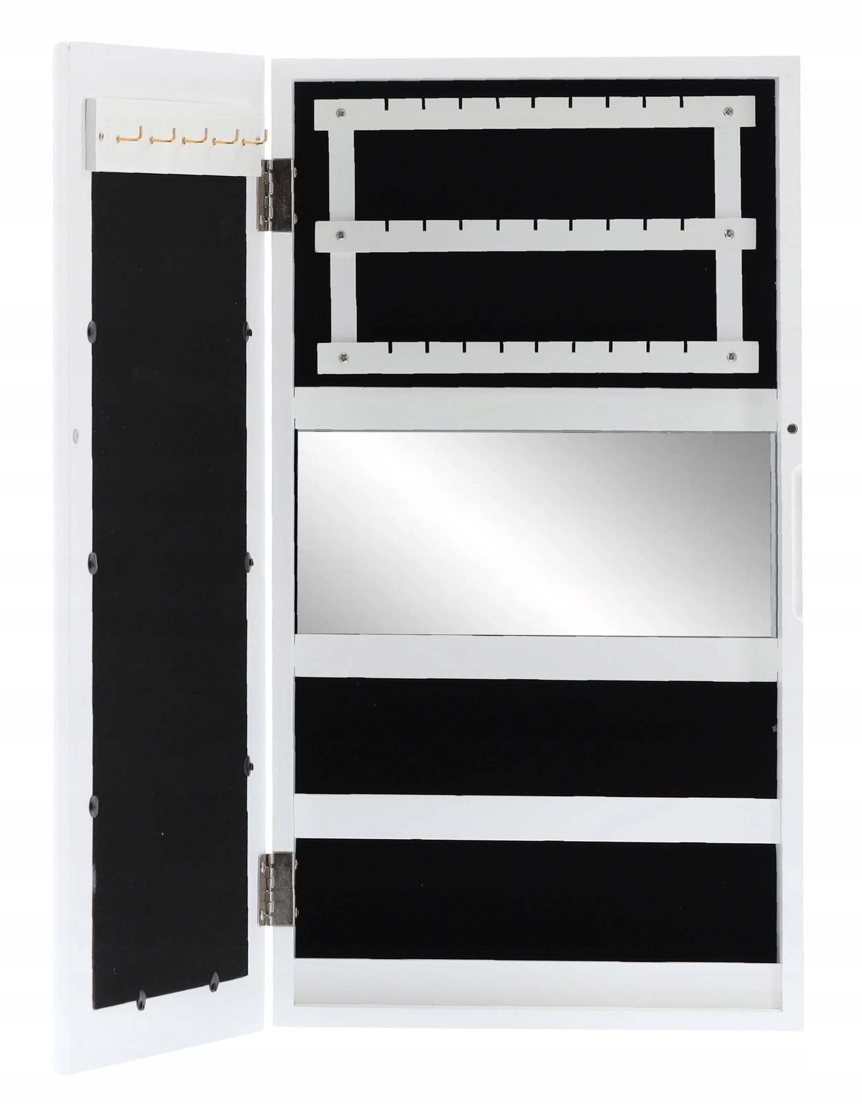 Elegancka wisząca szkatułka na biżuterię w białym kolorze utrzyma wszystkie Twoje skarby przejrzyście w jednym miejscu. Wewnątrz znajdziesz haczyki na naszyjniki i bransoletki, listwy na kolczyki, miękkie rzędy na pierścionki i zegarki, praktyczne półki oraz wbudowane lustro. Czarna aksamitna wyściółka chroni biżuterię przed zarysowaniami, kompaktowe wymiary oszczędzają miejsce, a nowoczesny, ponadczasowy design pasuje do każdego wnętrza.