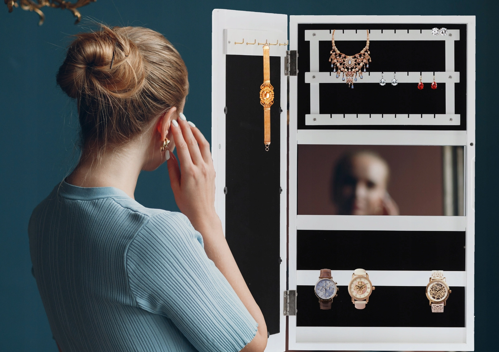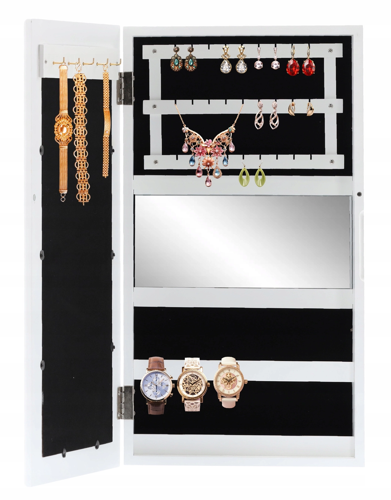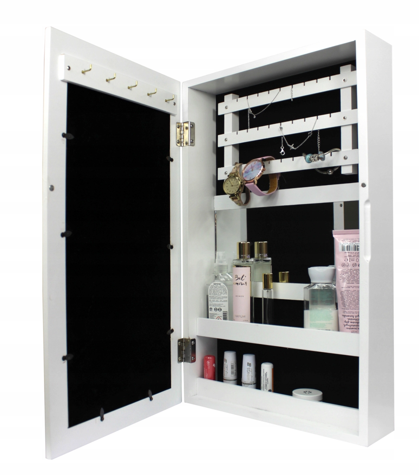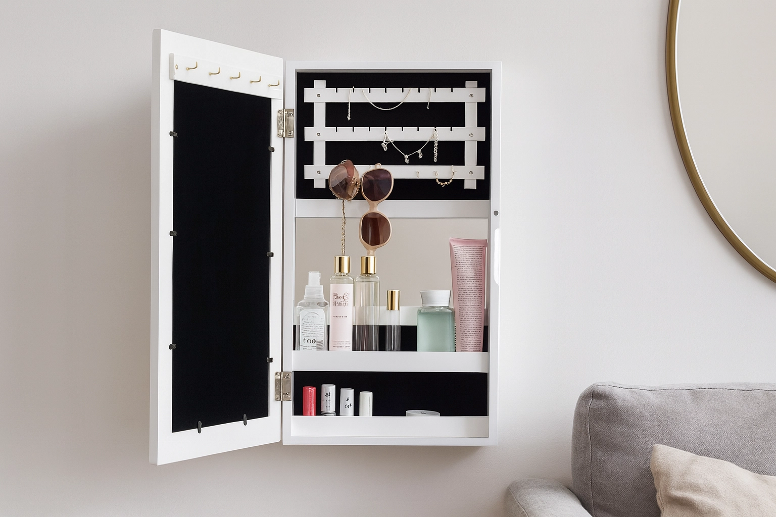 Lustro wewnątrz drzwiczek pozwala wygodnie dopasować biżuterię do stroju bez potrzeby podchodzenia do dużego lustra.