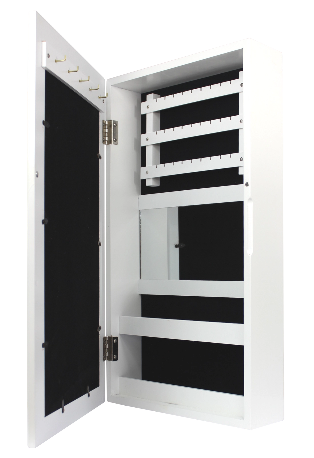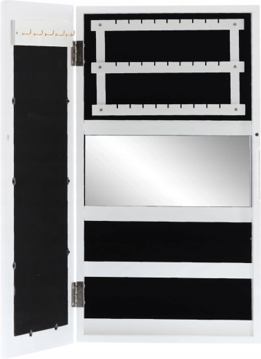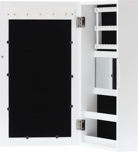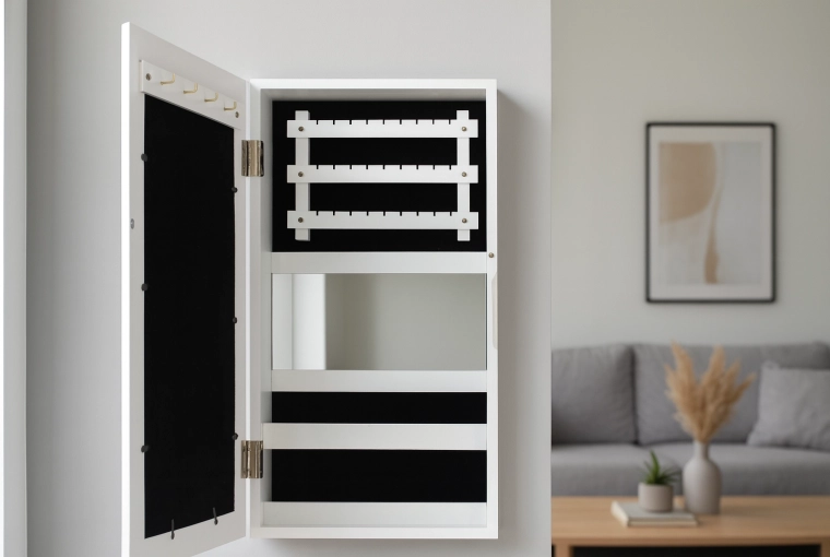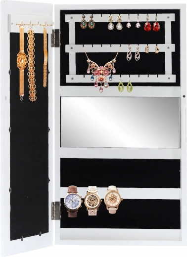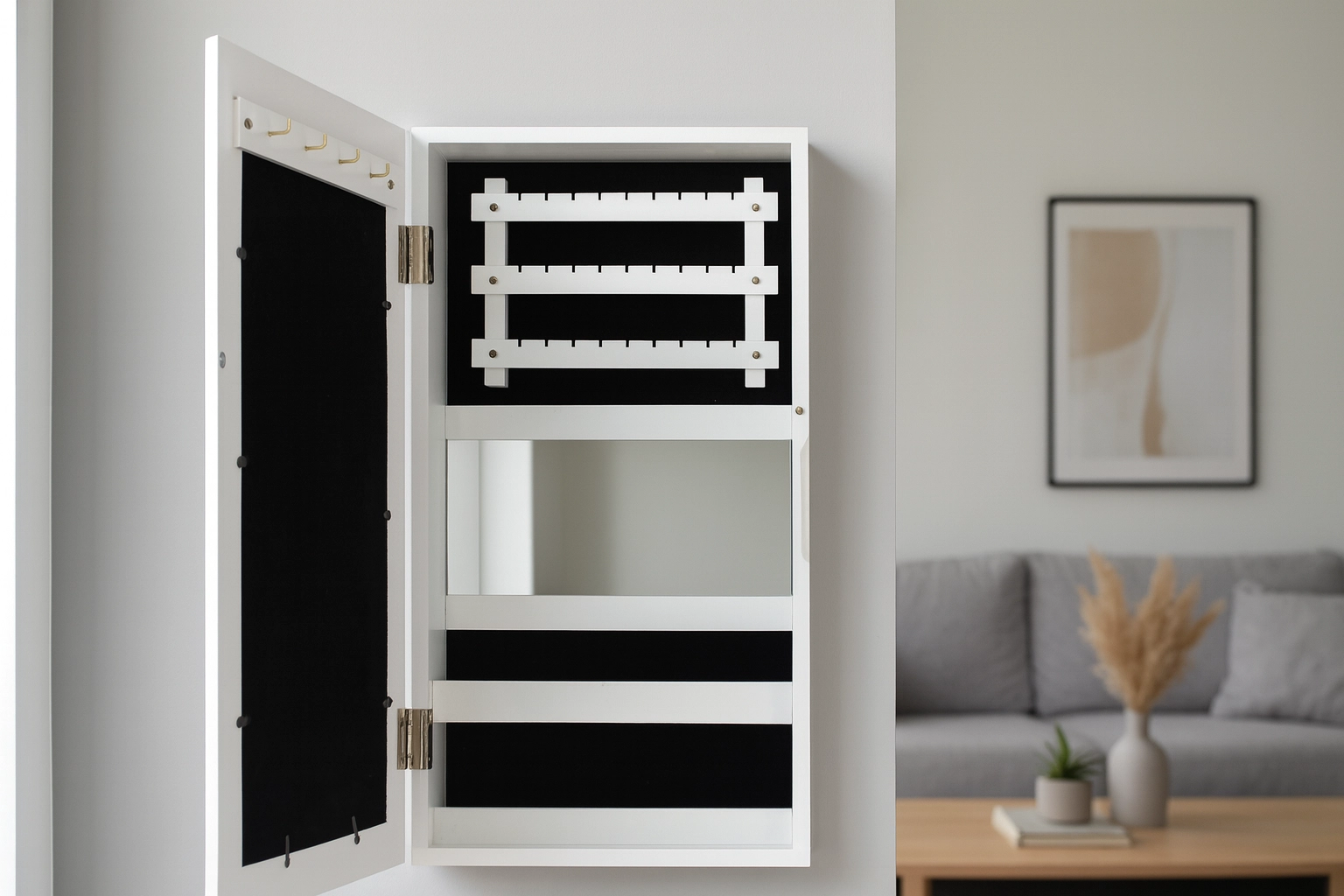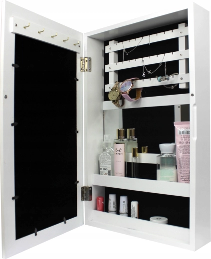 Lustro wewnątrz drzwiczek pozwala wygodnie dopasować biżuterię do stroju bez potrzeby podchodzenia do dużego lustra.