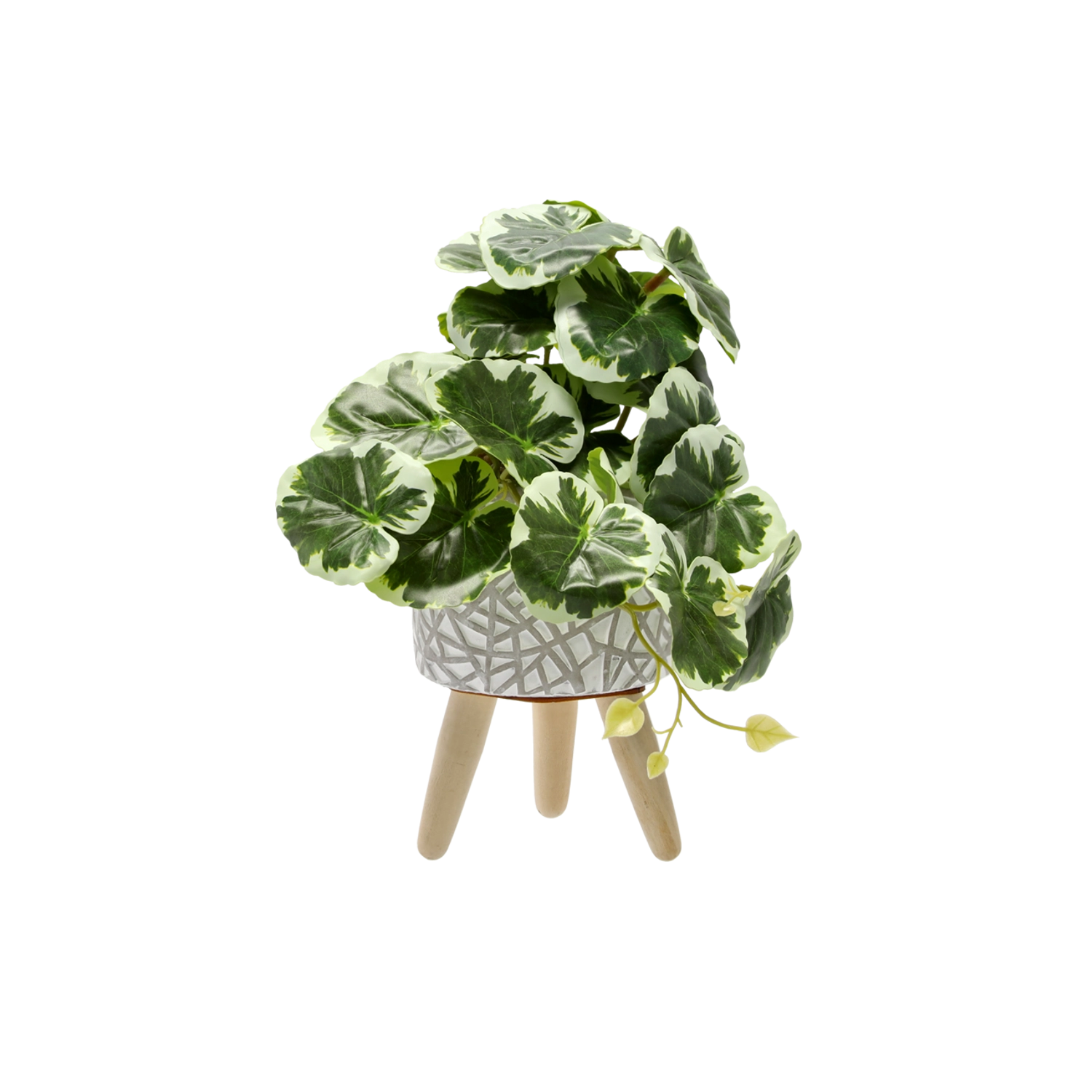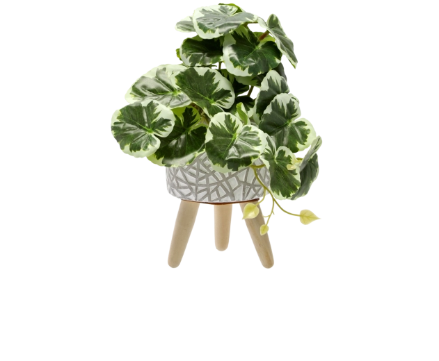 Stylowa i minimalistyczna dekoracja do nowoczesnych wnętrz. Sztuczna roślina o wysokości 20 cm z realistycznymi, dwukolorowymi liśćmi oraz elegancką doniczką na drewnianych nóżkach doda świeżości w domu i biurze bez troski o pielęgnację.