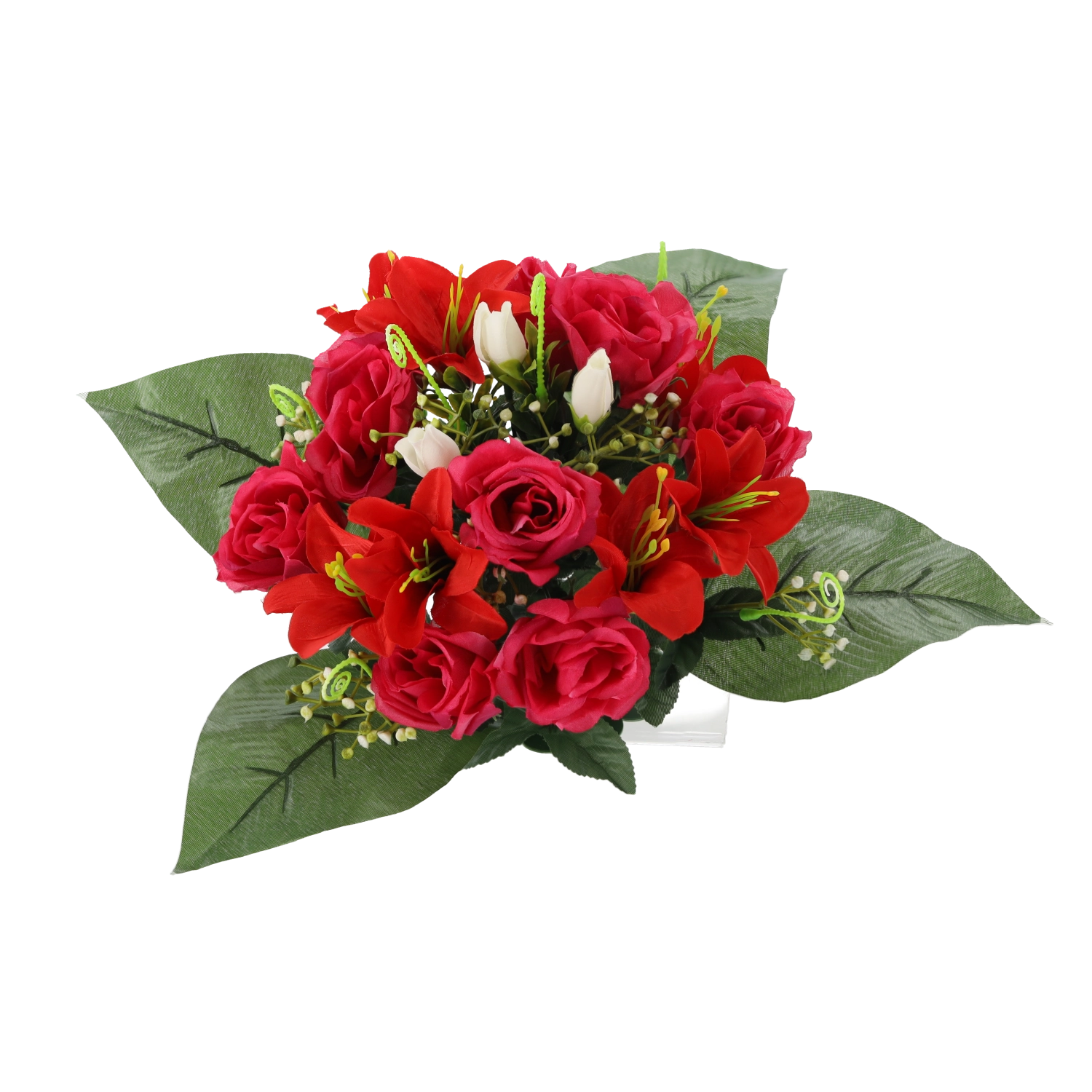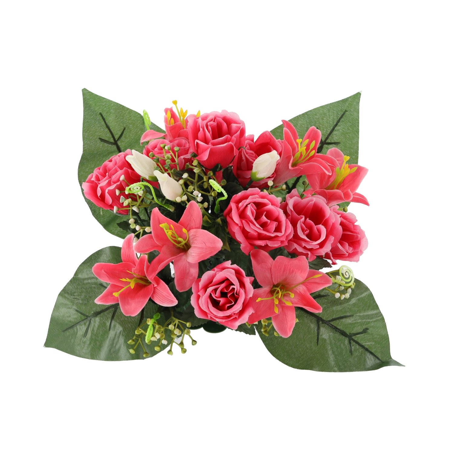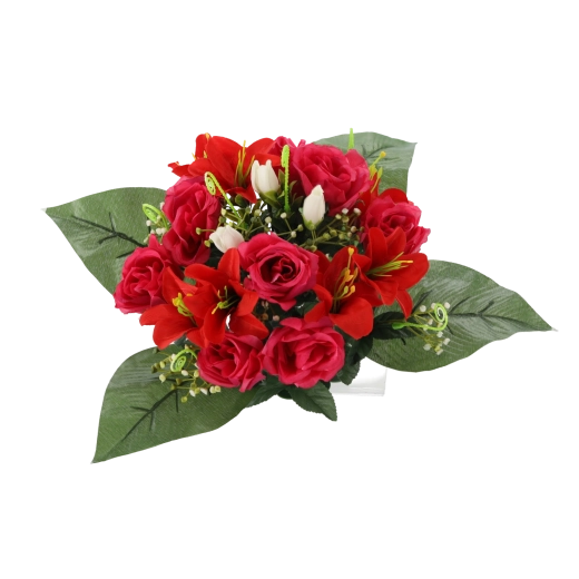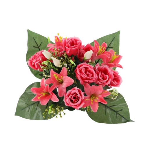 Ta stylowa sztuczna kompozycja kwiatowa łączy ponadczasowe piękno róż i lilii z bujną zielenią dla naturalnego wyglądu. Dzięki kompaktowym wymiarom 25 × 27 × 27 cm z łatwością mieści się na stole, komodzie czy parapecie, natychmiast dodając przestrzeni świeżości i elegancji.