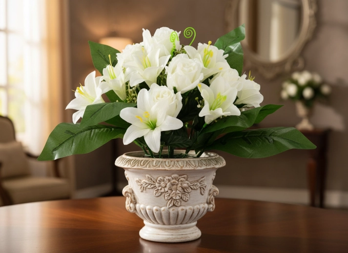 Precyzyjnie uformowane płatki i liście tworzą naturalne wrażenie świeżych kwiatów bez konieczności pielęgnacji.