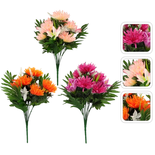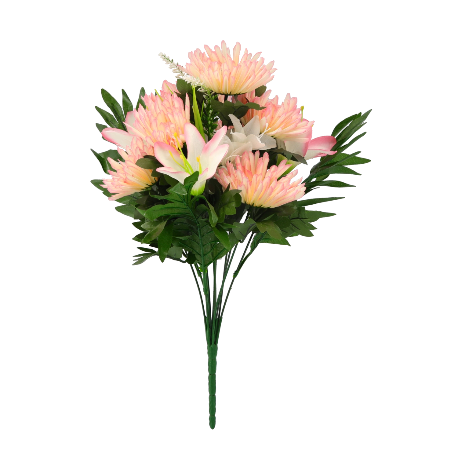 Starannie wykonane lilie i chryzantemy z gęstym ulistnieniem tworzą naturalny wygląd, który ozdobi każde wnętrze bez konieczności pielęgnacji.