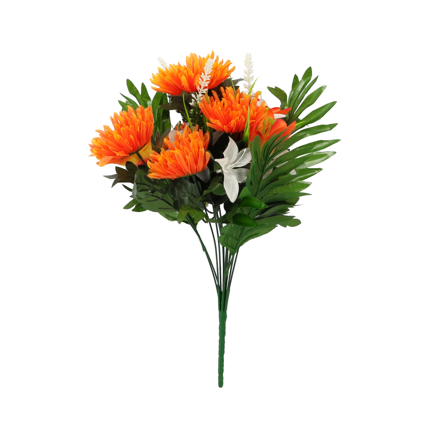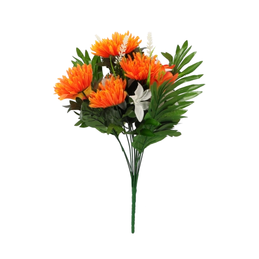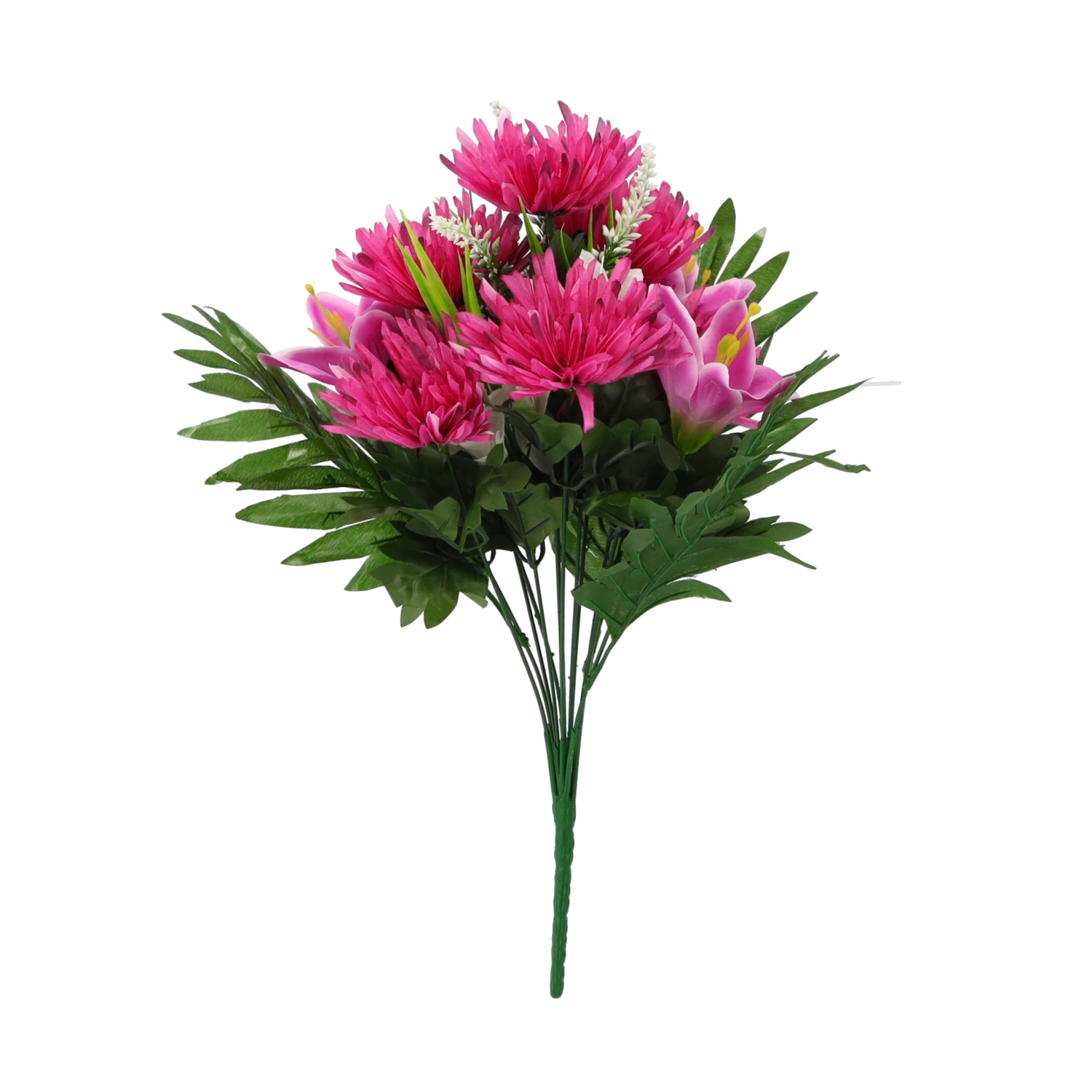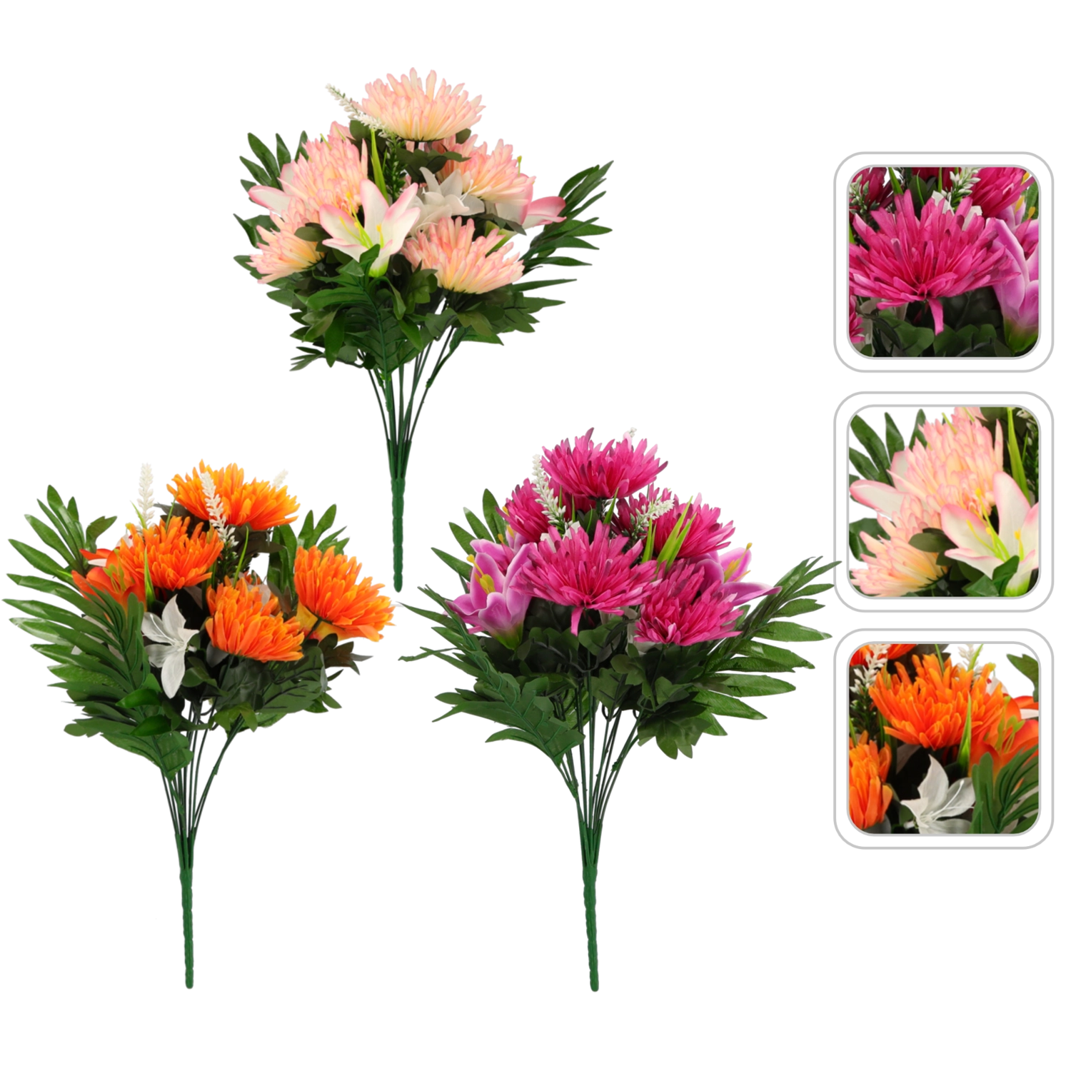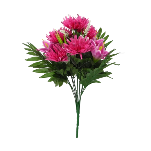 Stwórz efektowną kwiatową dekorację w mgnieniu oka. Ten sztuczny bukiet z liliami i chryzantemami zachwyca wiernym wykonaniem, bujnym ulistnieniem oraz żywymi kolorami w odcieniach różu i pomarańczu. Nie wymaga podlewania ani specjalnych warunków, dlatego doskonale sprawdzi się również w miejscach z minimalnym światłem dziennym.