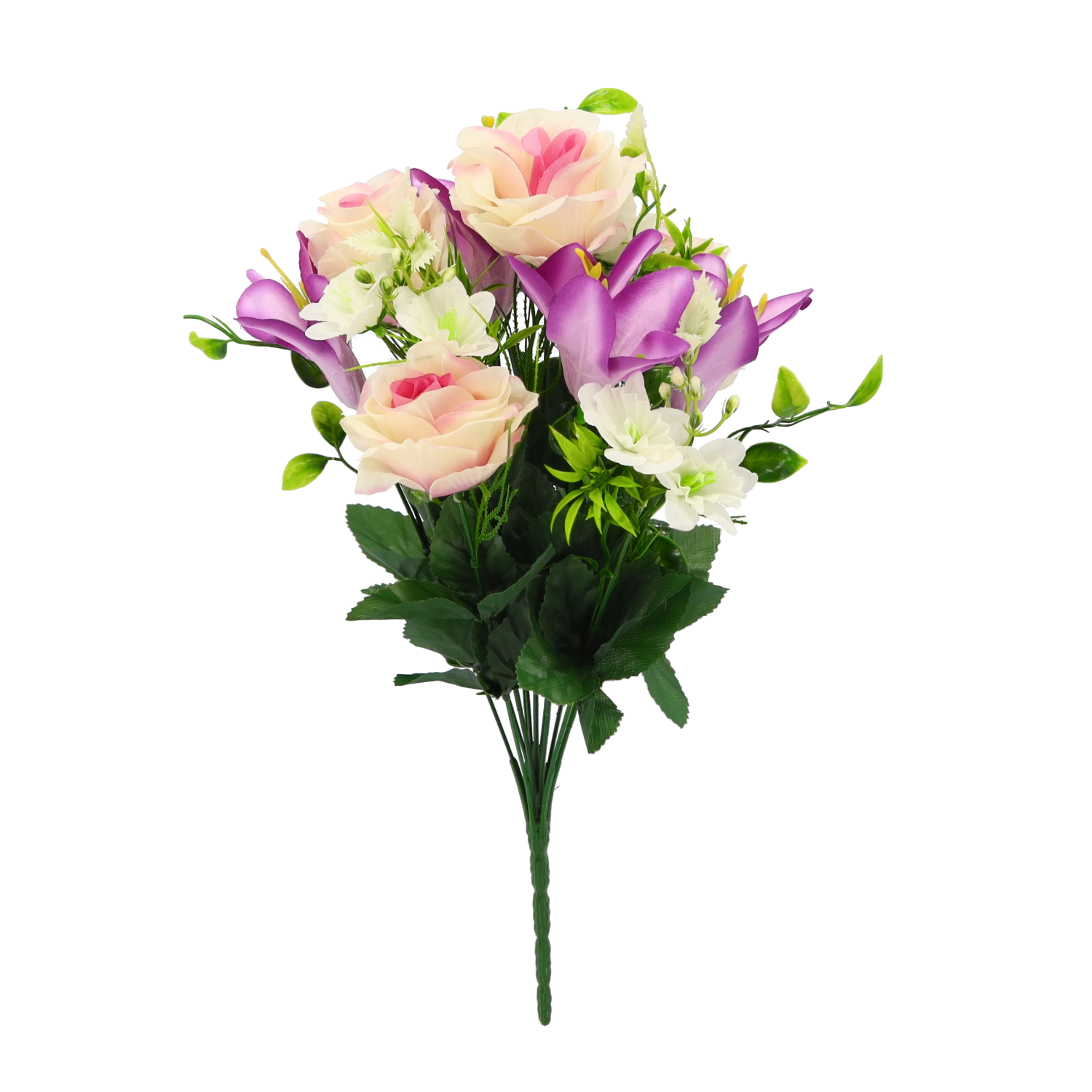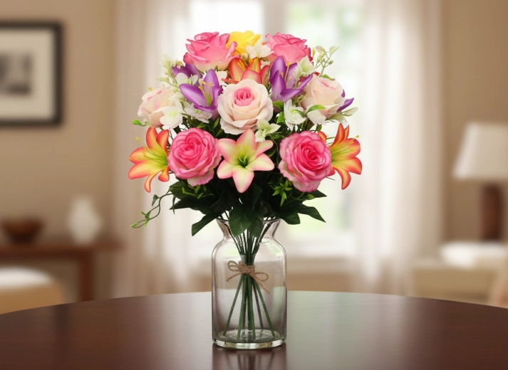 Wnieś do wnętrza ponadczasowe piękno kwiatów bez zbędnych obowiązków. Ten sztuczny bukiet róż i lilii oferuje wierne odwzorowanie płatków i liści, stabilny kształt i długą żywotność. Dzięki miksowi wariantów kolorystycznych z łatwością dopasujesz bukiet do nowoczesnych i klasycznych aranżacji.