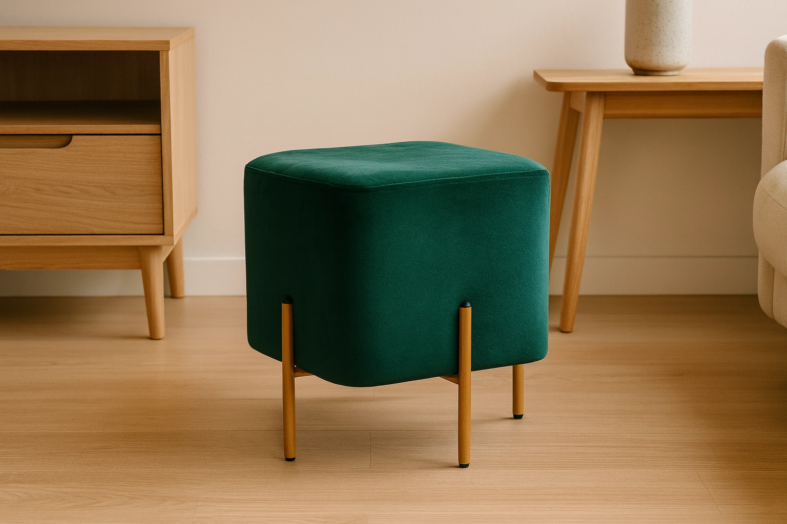 Elegancki kwadratowy puf z miękką welwetową tapicerką i stabilnymi metalowymi nogami w złotym kolorze doda Twojemu wnętrzu szyku i funkcjonalności. Oferuje miękkie i wygodne siedzisko, kompaktowe wymiary 35 × 35 × 40 cm oraz uniwersalne zastosowanie jako podnóżek, dodatkowe miejsce do siedzenia lub stolik pomocniczy. Stabilna konstrukcja i stylowe złote detale świetnie sprawdzą się w salonie, sypialni i przedpokoju.