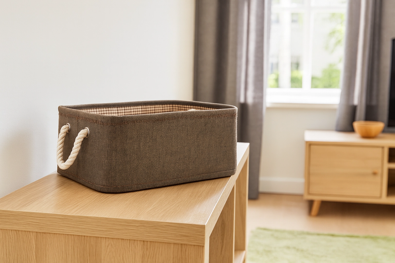 Kosz wykonano z wytrzymałej tkaniny dla długiej żywotności i łatwej pielęgnacji. Mocne plecione linowe uchwyty umożliwiają wygodne przenoszenie, a wewnętrzna podszewka z dekoracyjnym wzorem nadaje mu elegancki wygląd. Miękkie boki oszczędzają miejsce i pozwalają na łatwe ustawienie na półkach lub w szafie.