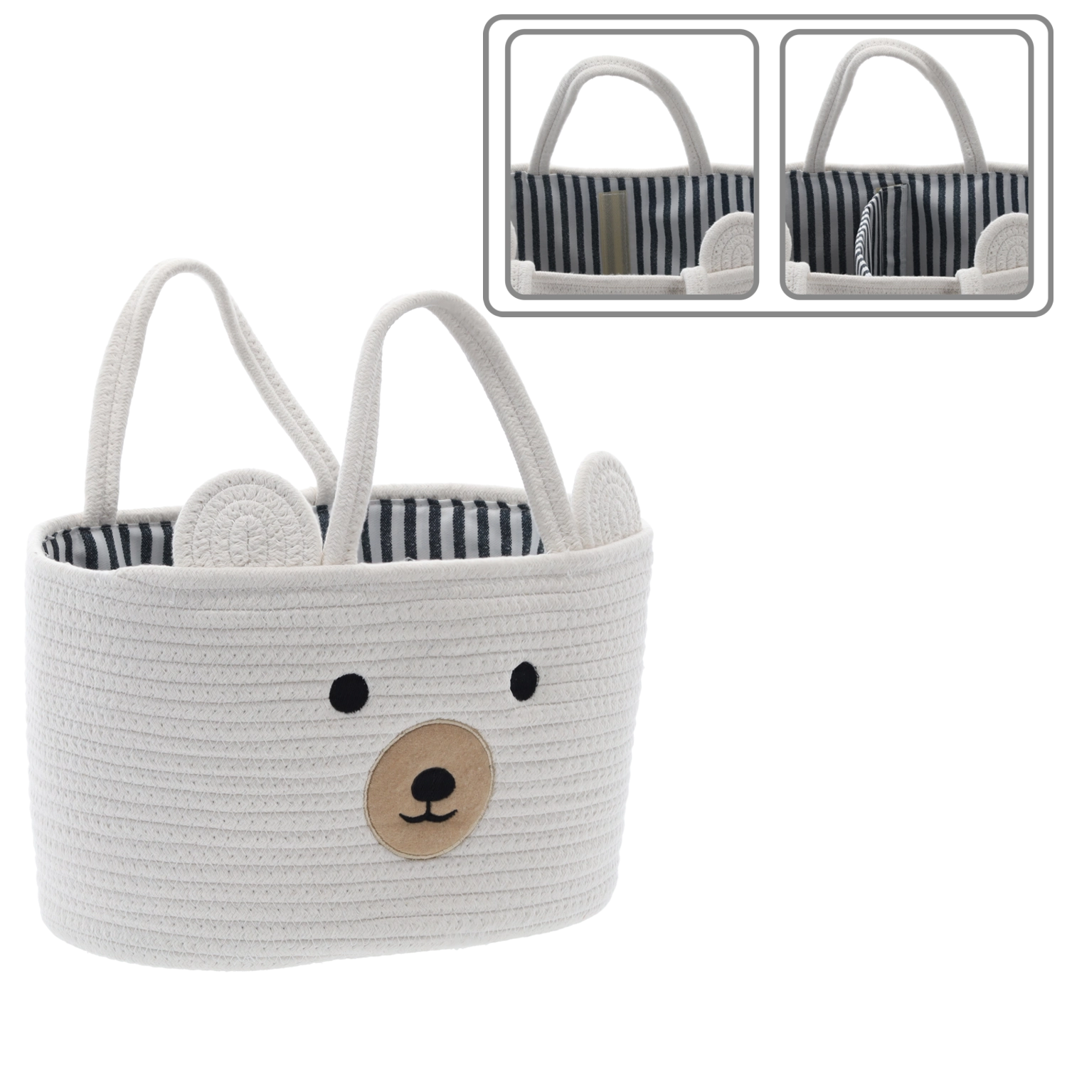 Odkryj stylowe i bezpieczne przechowywanie z białym tekstylnym koszykiem z uszkami i delikatną zwierzęcą buźką. Neutralny kolor pasuje do pokoju dziecięcego, sypialni i salonu, podkreślając przytulną atmosferę domu. Dzięki sztywnym ściankom i lekkiej konstrukcji świetnie sprawdza się w codziennym użytkowaniu i przenoszeniu.