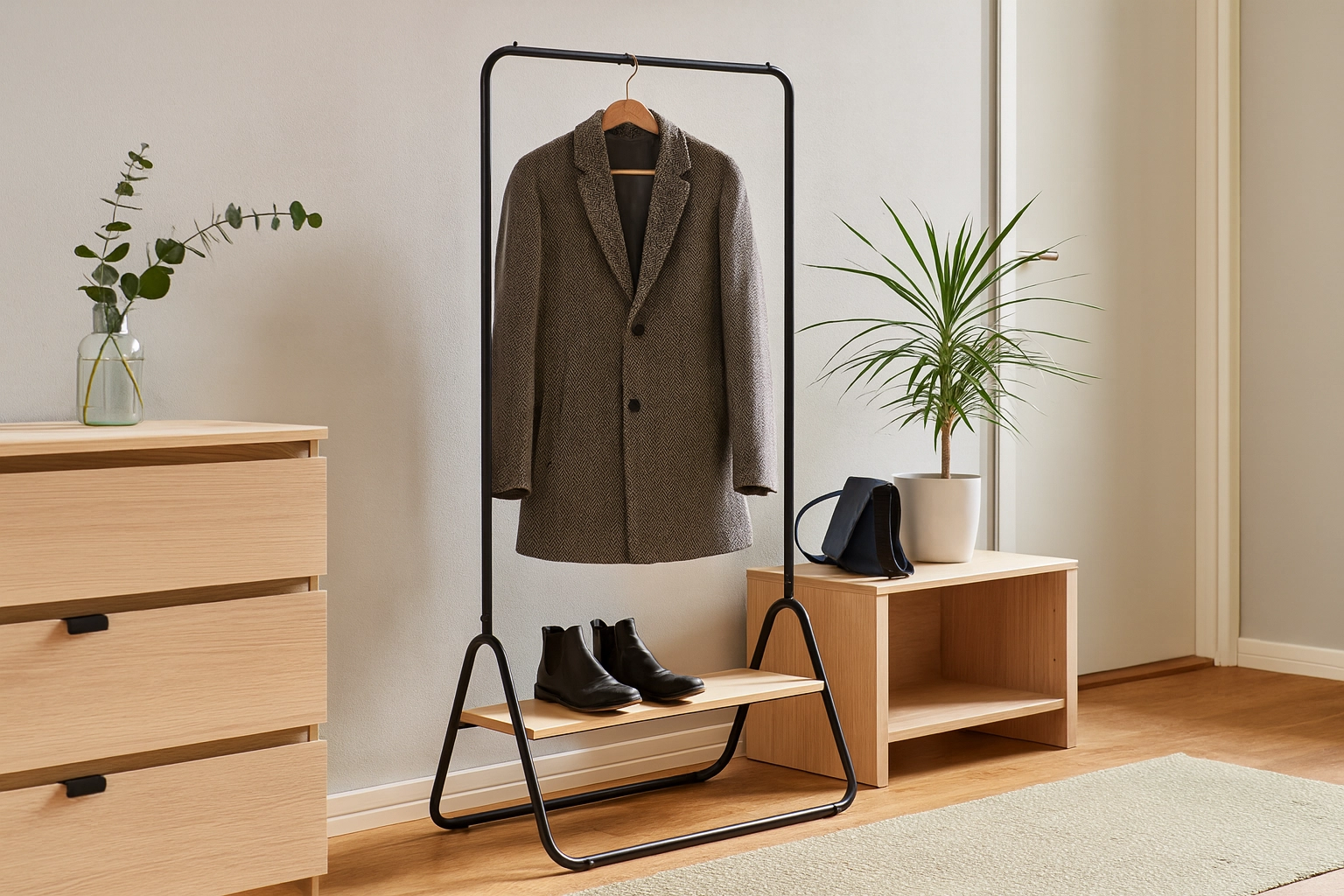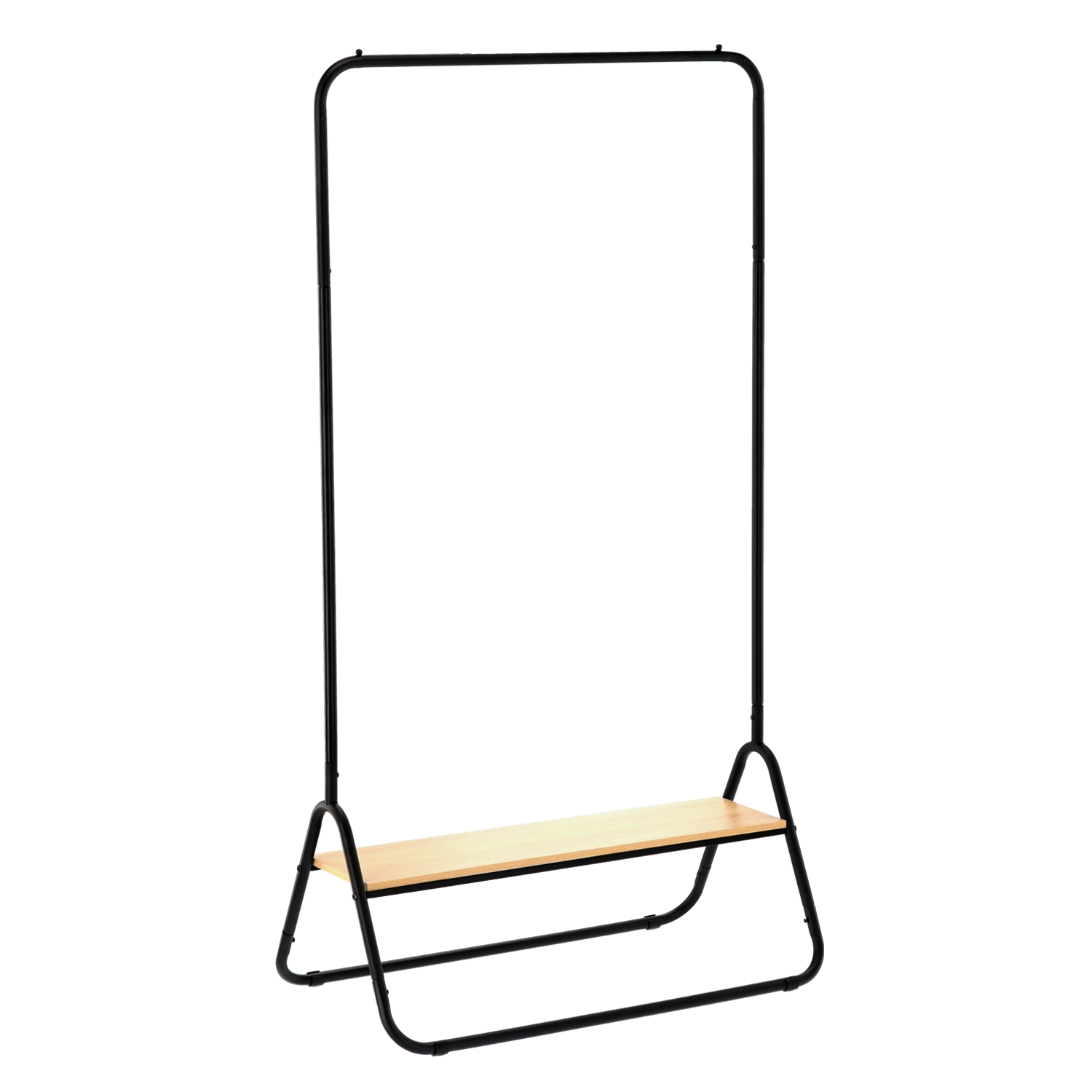 Utrzymaj porządek z minimalistycznym wieszakiem, który łączy funkcjonalność i nowoczesny wygląd. Czarny metal w połączeniu z dekorem drewna wpasuje się w każde wnętrze – od nowoczesnego po klasyczne. Dzięki wolnostojącej konstrukcji łatwo ustawisz go tam, gdzie akurat potrzebujesz.