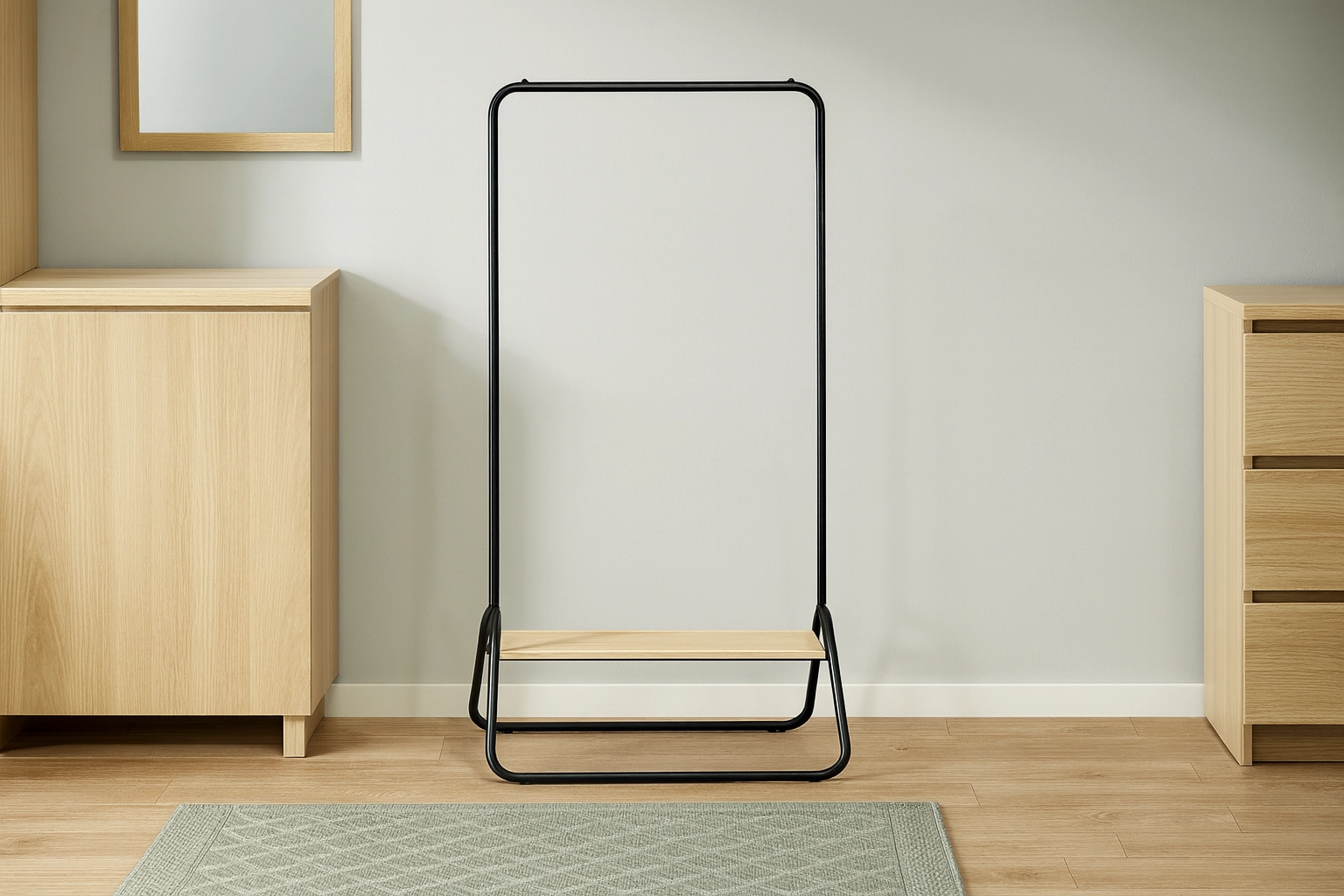 Rama malowana proszkowo jest odporna na zarysowania i korozję. Wystarczy postawić wieszak – bez wiercenia w ścianach i skomplikowanego montażu.