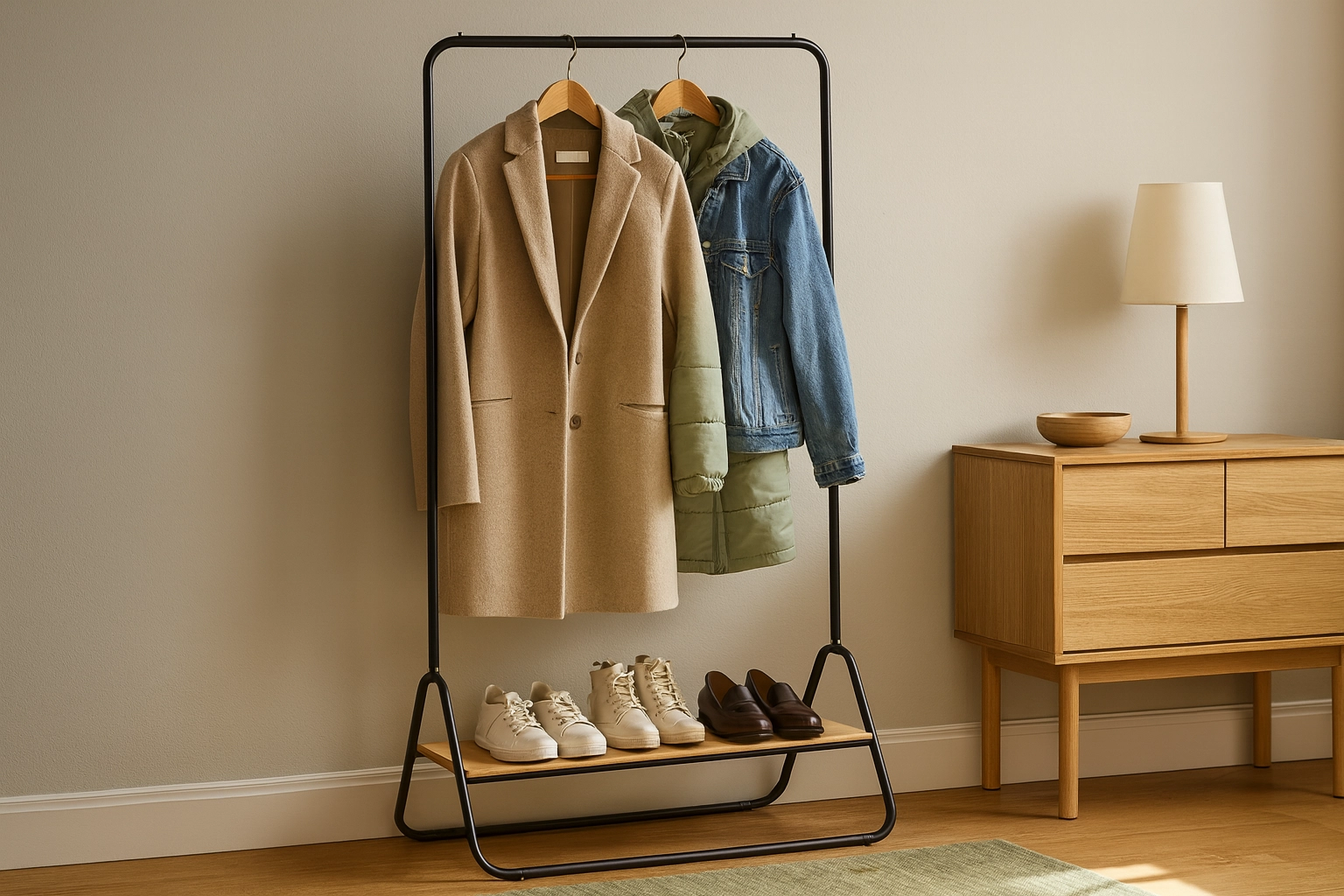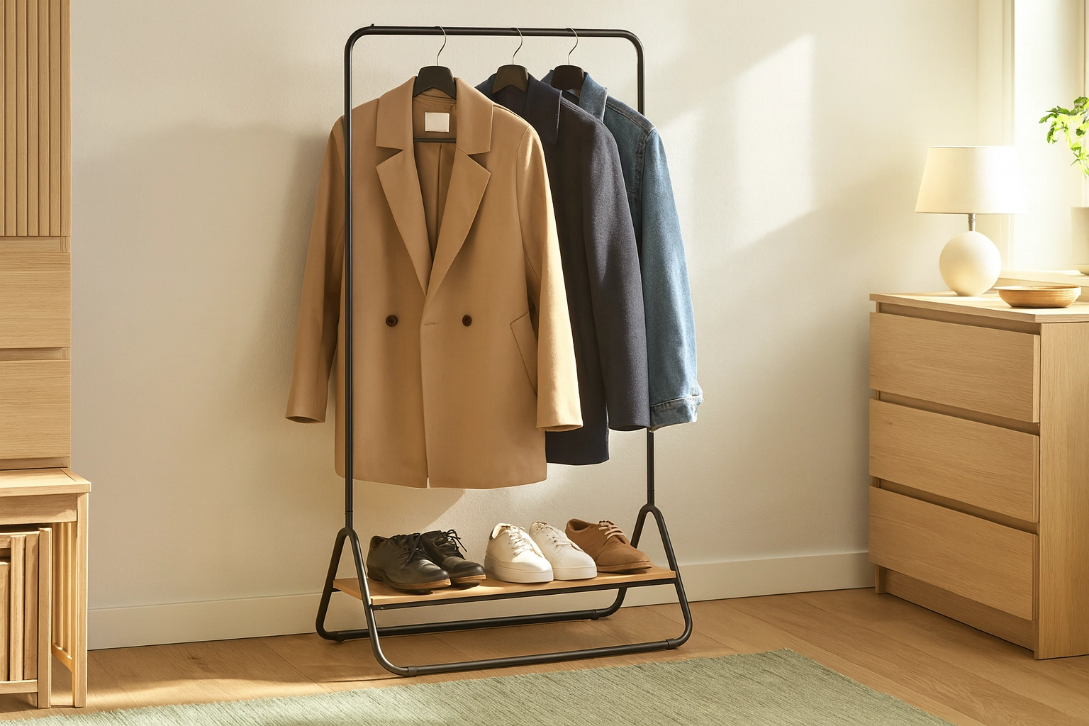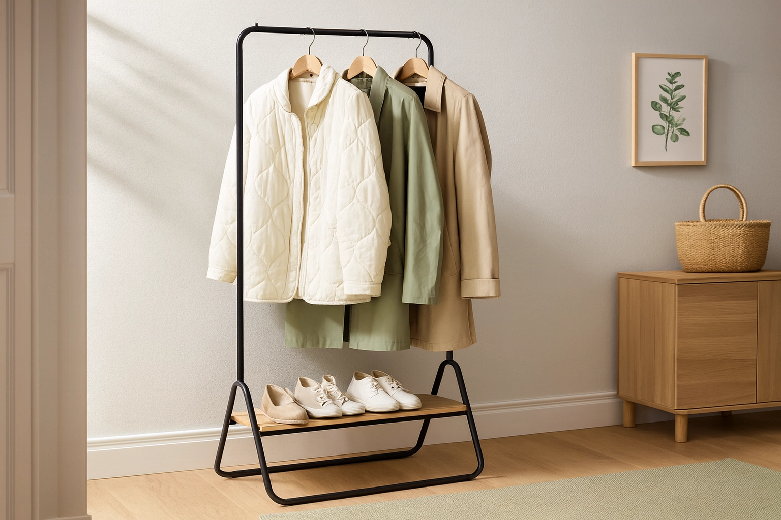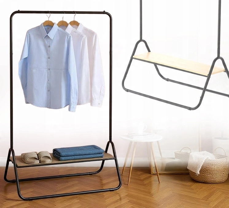 Dolna półka z MDF o grubości 12 mm jest idealna na buty, torby i kosze do przechowywania, natomiast górny drążek pomieści codzienne ubrania oraz bardziej obszerne płaszcze. Malowanie proszkowe zwiększa odporność na zarysowania i korozję, dzięki czemu wieszak sprawdzi się w długotrwałym użytkowaniu.