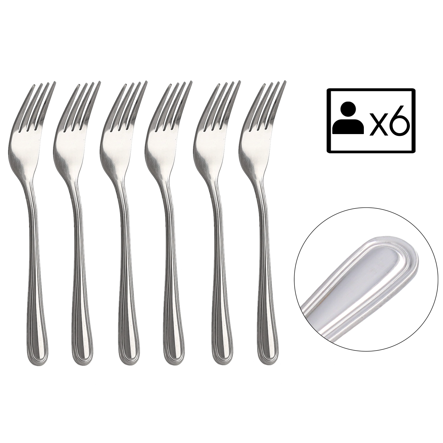 Elegancki zestaw 6 widelczyków do ciasta ze szlachetnej stali nierdzewnej w klasycznym designie London z delikatnym obramowaniem. Trwałe, ponadczasowe i uniwersalne wykonanie, które pasuje do każdego serwisu i jest idealne do podawania deserów przy każdej okazji.