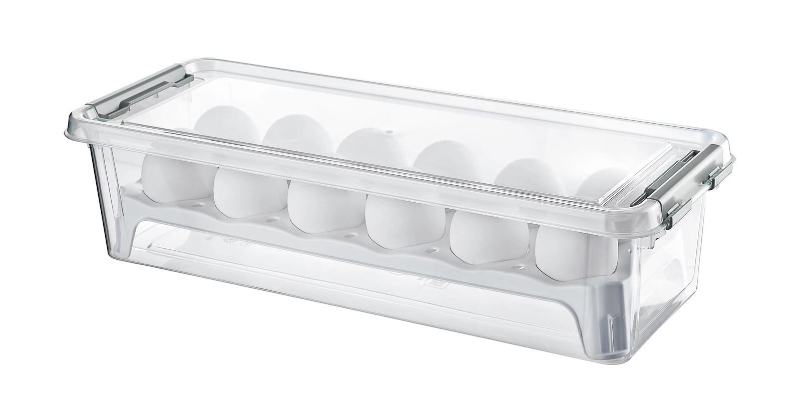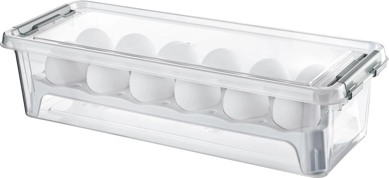 Utrzymaj porządek w lodówce i chroń jajka przed uszkodzeniem. Ten prostokątny pojemnik mieści do 12 jaj i jest wykonany z wysokiej jakości, bezpiecznego dla zdrowia plastiku bez BPA. Ergonomiczna pokrywka z łatwym otwieraniem ułatwia obsługę, a solidna konstrukcja zapewnia bezpieczne przechowywanie także podczas przenoszenia.