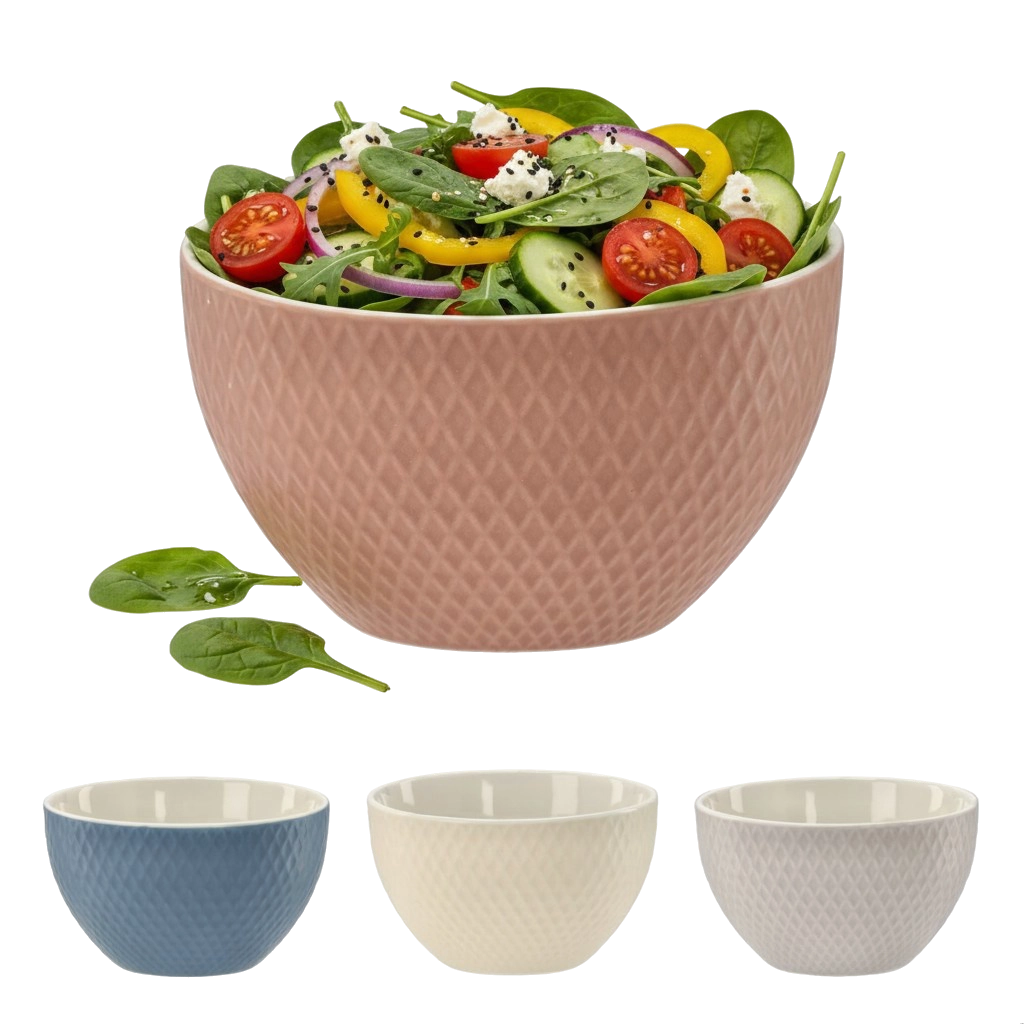 Reliefowa powierzchnia zwiększa estetykę i funkcjonalność – miska lepiej leży w dłoni i nie ślizga się podczas serwowania zup, sałatek czy deserów.