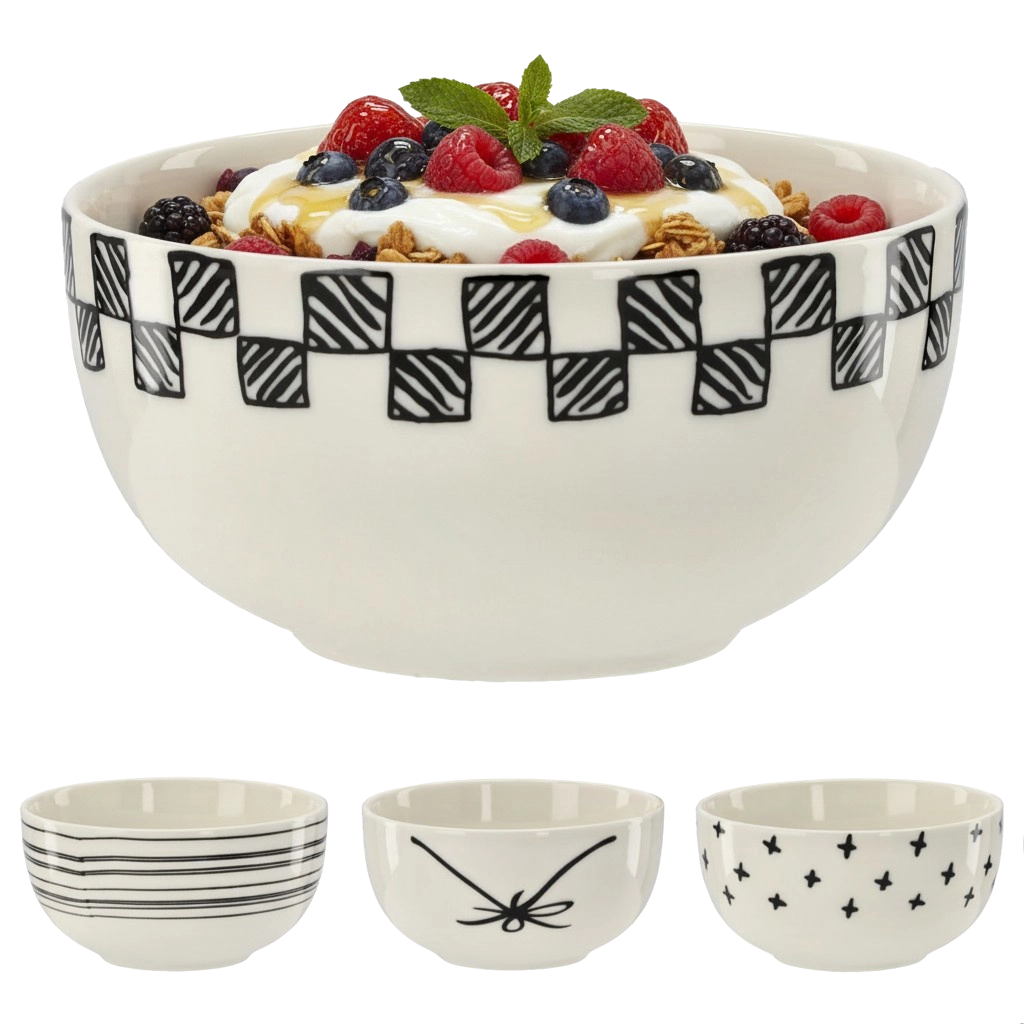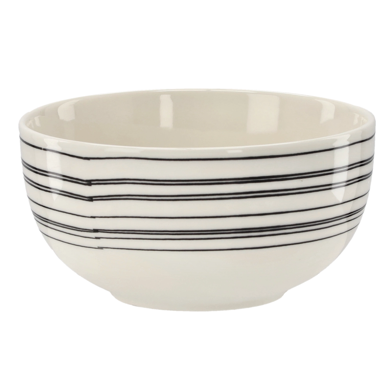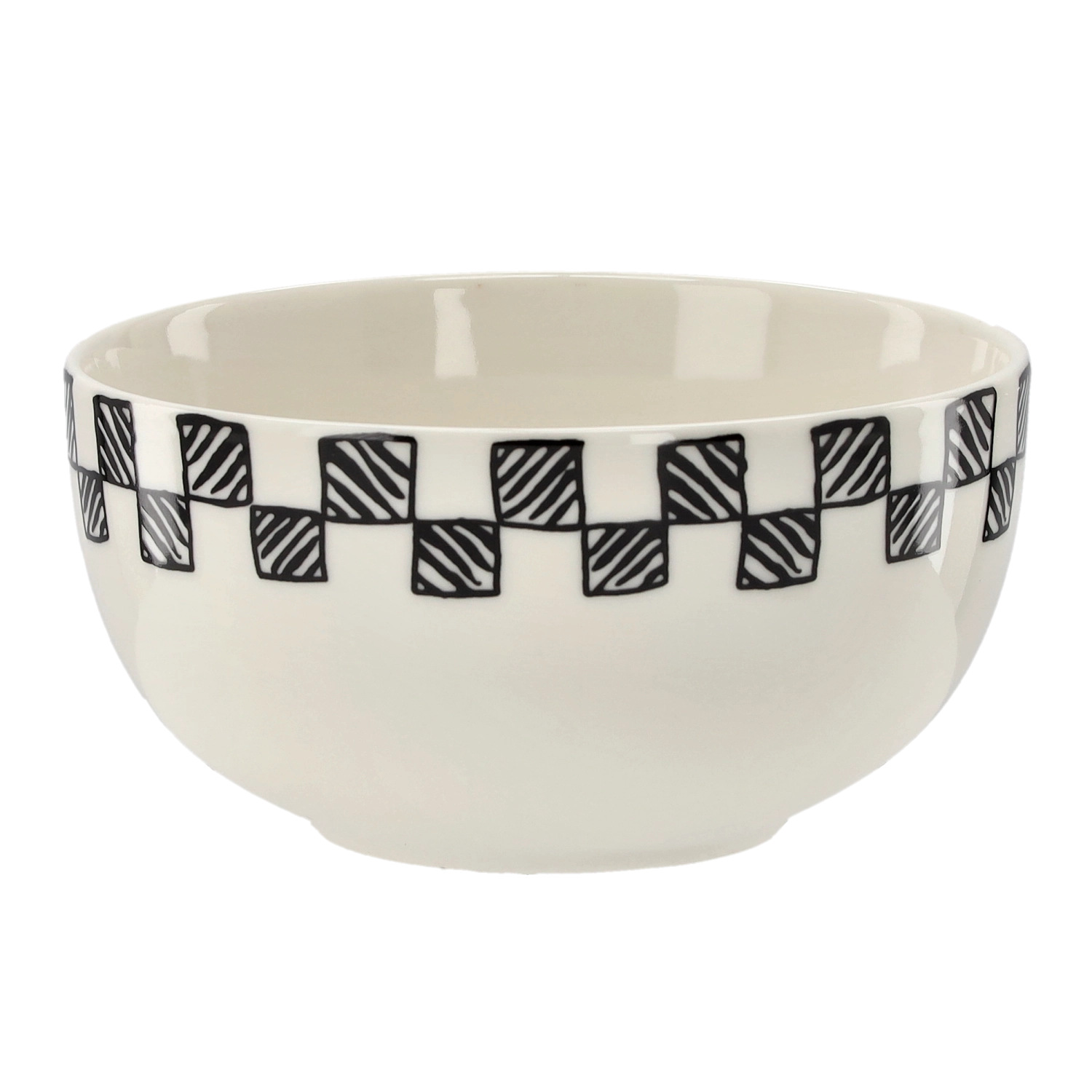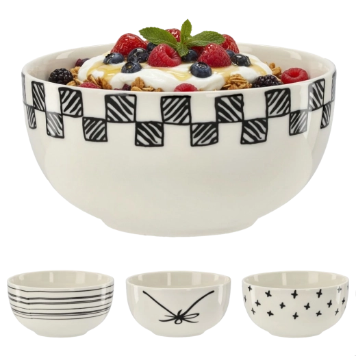 Zafunduj sobie perfekcyjne serwowanie z miską Black & White o pojemności 550 ml. Dzięki wysokiej jakości ceramice i błyszczącej glazurze sprawdzi się do płatków śniadaniowych, zup, sałatek i przekąsek. Minimalistyczne czarno-białe motywy podkreślą każdy stół i łatwo je skomponujesz z inną zastawą.