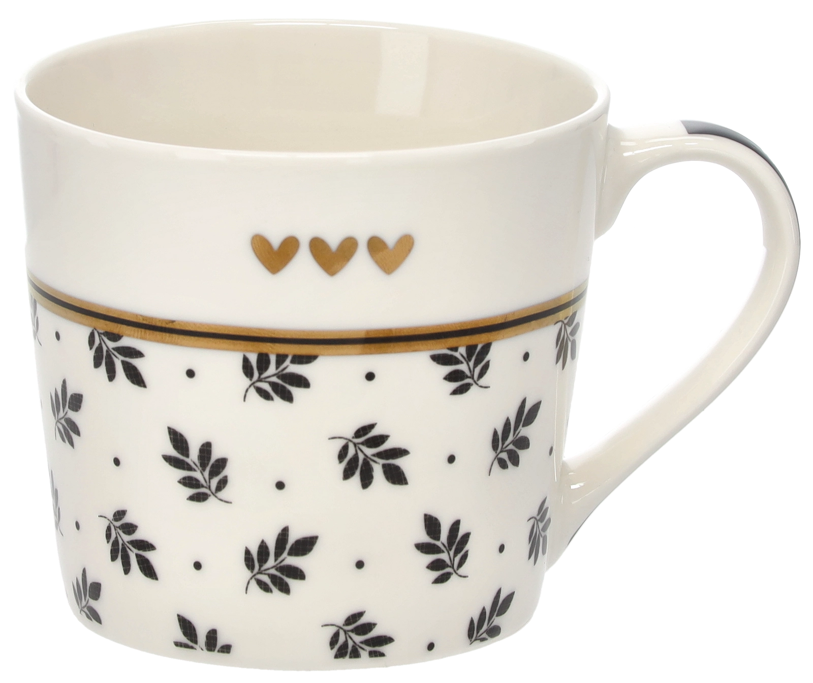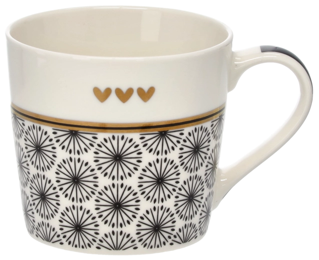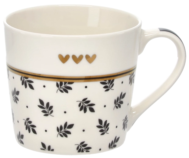Delikatny motyw gałązek uzupełniony trzema małymi serduszkami i złotym paskiem nadaje kubkowi wyszukany wygląd, który wyróżni się na każdym stole.