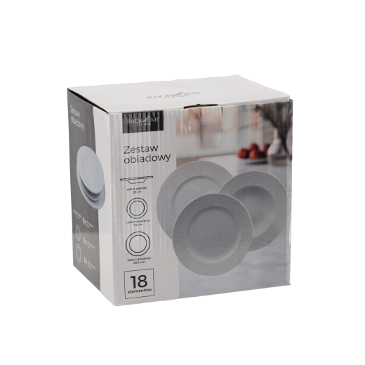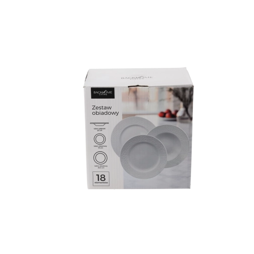 Elegancki okrągły zestaw obiadowy z wysokiej jakości porcelany, składający się z 18 elementów w ponadczasowym białym kolorze. Doskonały na co dzień oraz na uroczyste okazje. Zawiera talerze w trzech rozmiarach do kompletnego serwowania dań głównych, zup i deserów.