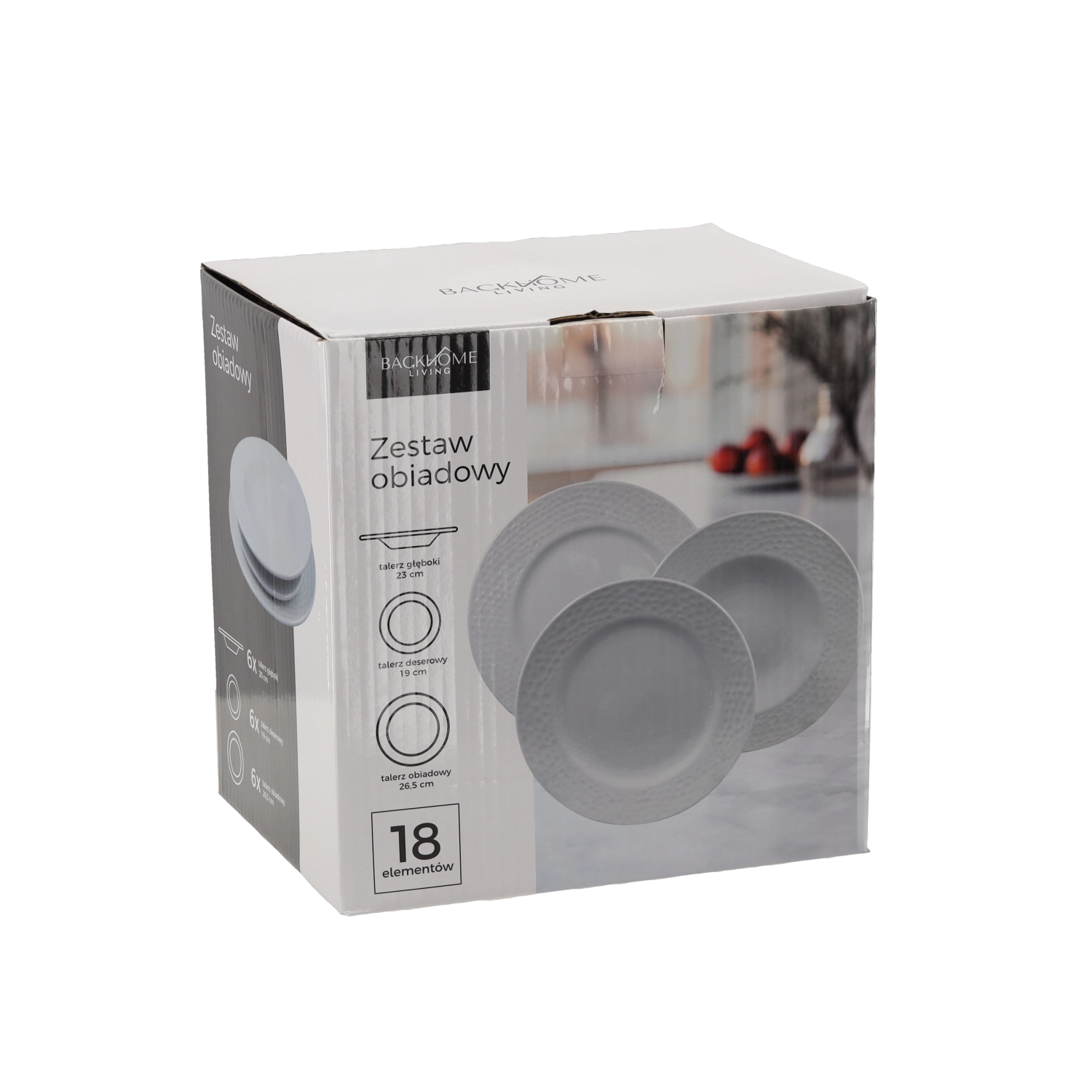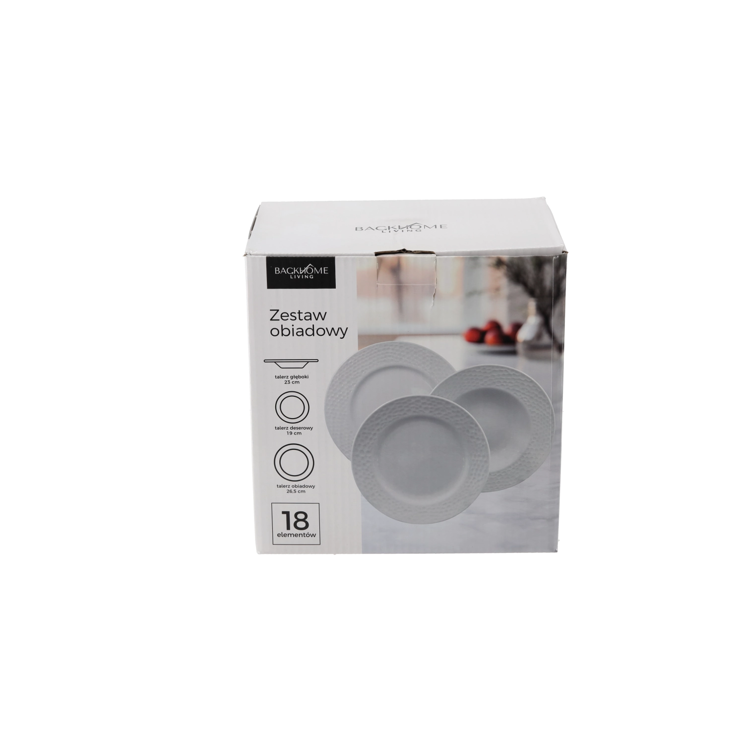 - Kompletny zestaw dla 6 osób: 3 typy talerzy po sześć sztuk.
