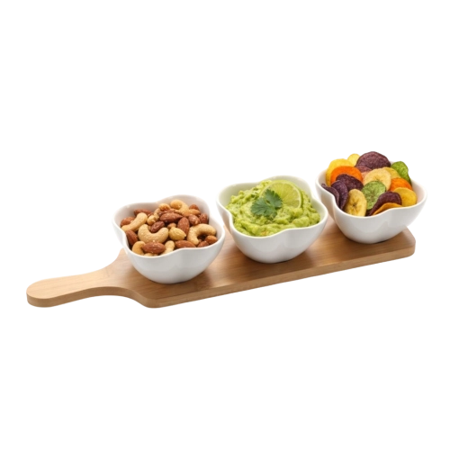 Elegancki zestaw trzech porcelanowych miseczek w kształcie czterolistnej koniczyny na podłużnej bambusowej tacy jest idealny do serwowania przystawek, dipów i przekąsek. Miseczki z wysokiej jakości białej ceramiki są trwałe, łatwe w utrzymaniu i można je używać w zmywarce oraz kuchence mikrofalowej. Bambusowa taca jest łatwa w utrzymaniu, odporna na wilgoć i zapewnia stabilność podczas przenoszenia.