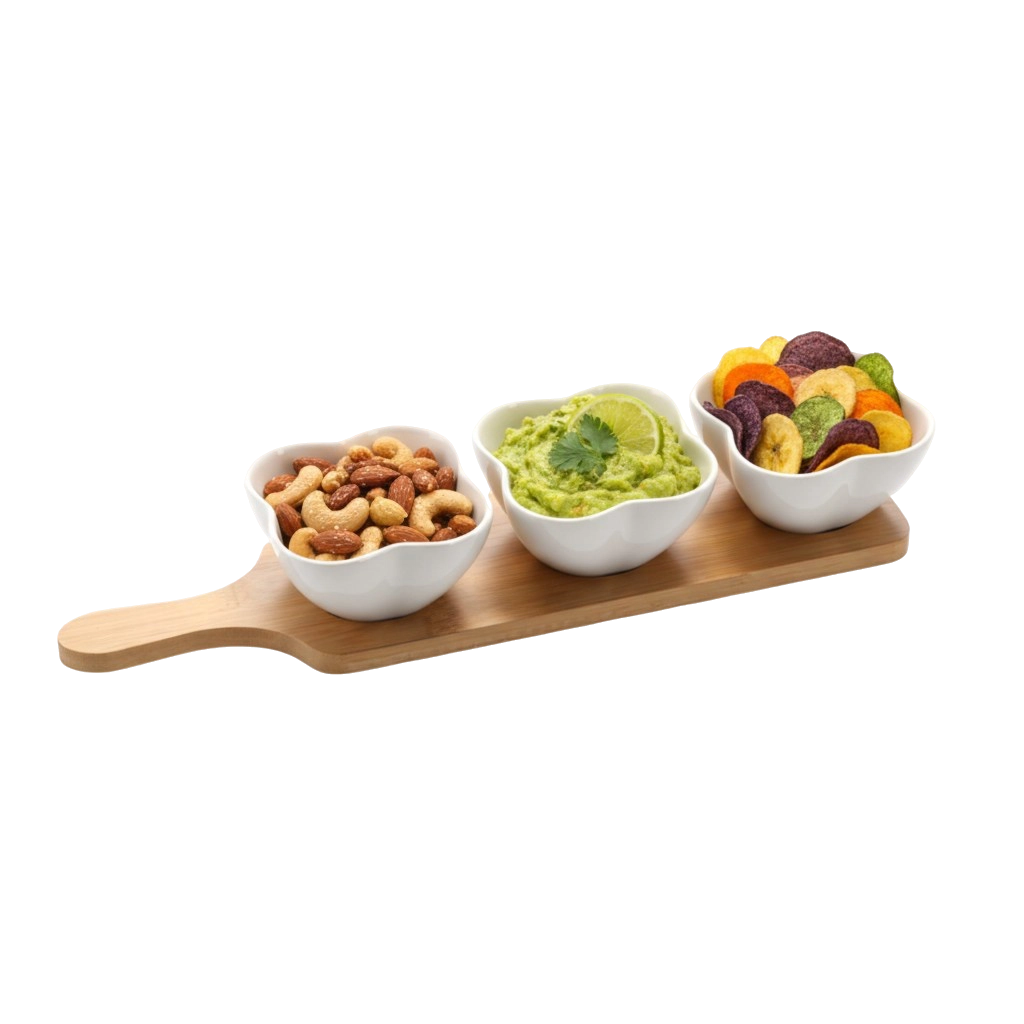 Ta stylowa trójka miseczek w kształcie czterolistnej koniczyny doda Twojemu stołowi szyku i porządku. Kompaktowe wymiary 9 × 9 × 4 cm są idealne na oliwki, orzechy, antipasti, sosy czy dipy. Naturalna bambusowa taca z wyznaczonymi miejscami trzyma miseczki pewnie na swoim miejscu i ułatwia serwowanie.
