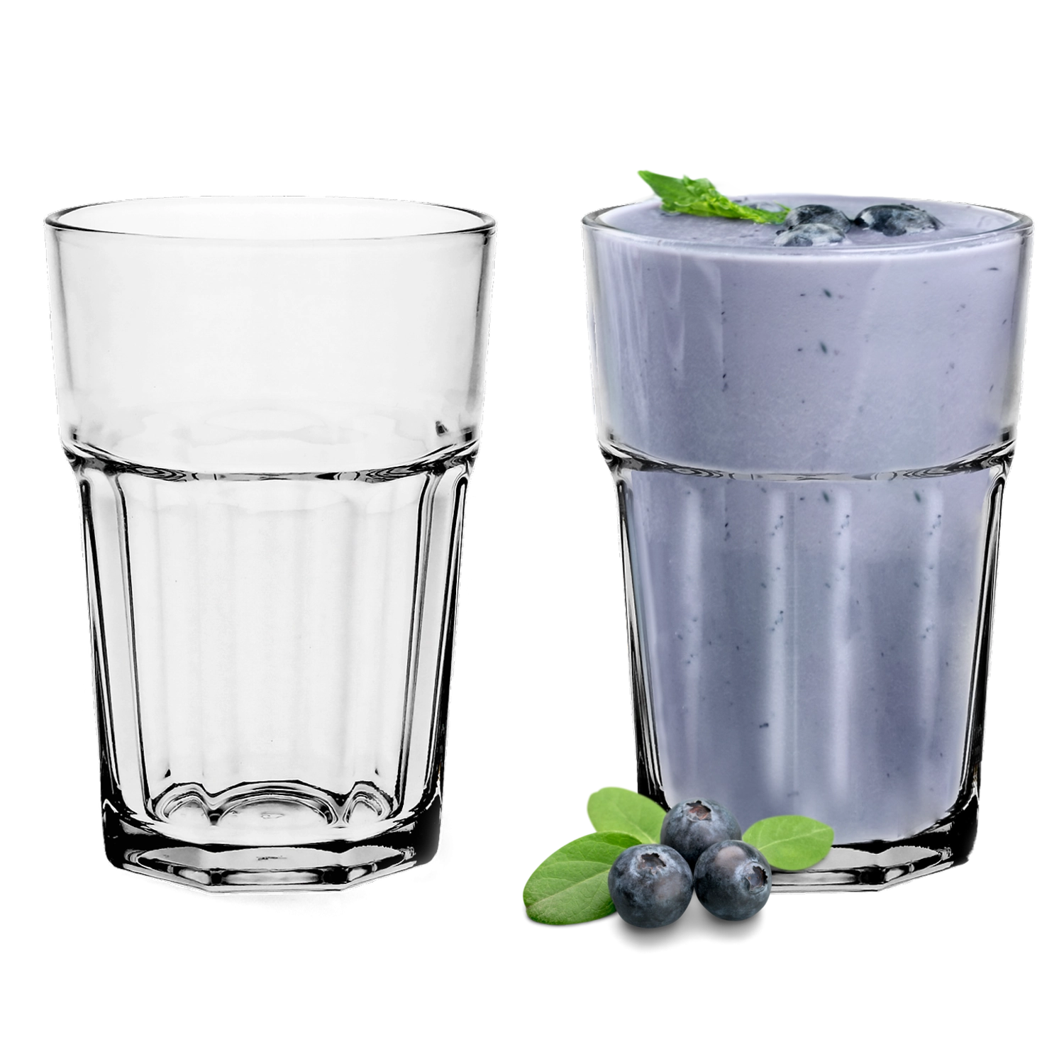 Szklanki o pojemności 365 ml są perfekcyjne do mojito, long drinków i bezalkoholowych lemoniad – przestronne, praktyczne i wizualnie efektowne.