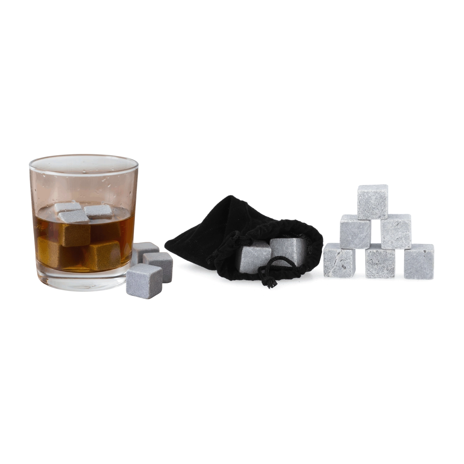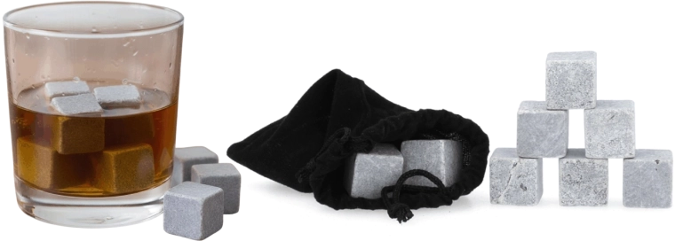 Schłodź swój napój bez rozcieńczania z eleganckimi kamiennymi kostkami. Wykonane z naturalnego kamienia, utrzymują whisky lub bourbon przyjemnie chłodne i nie zmieniają smaku ani aromatu. Wystarczy włożyć je na kilka godzin do zamrażarki, a następnie dodać do szklanki. Są wielokrotnego użytku, łatwe w utrzymaniu i dostarczane z praktycznym aksamitnym woreczkiem do przechowywania i przenoszenia.