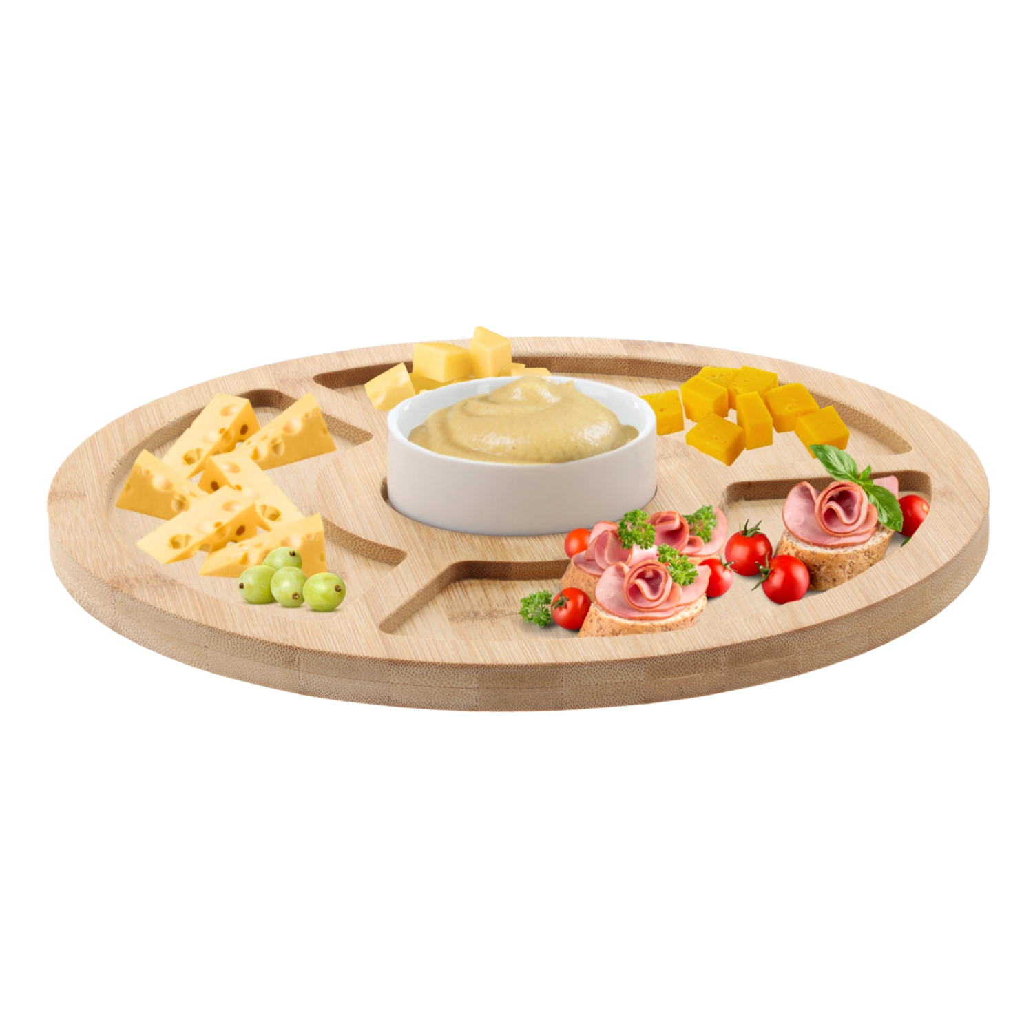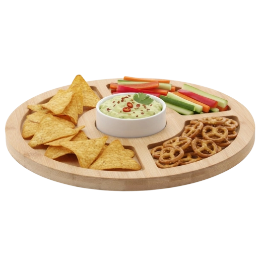 Ta okrągła bambusowa taca do serwowania z porcelanową miseczką to świetne rozwiązanie na domowe przyjęcia i spotkania towarzyskie. Dzięki czterem oddzielnym sekcjom każdy rodzaj przekąsek pozostaje na swoim miejscu, a centralna porcelanowa miseczka idealnie nadaje się na dipy i sosy.