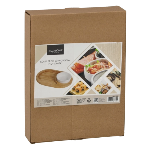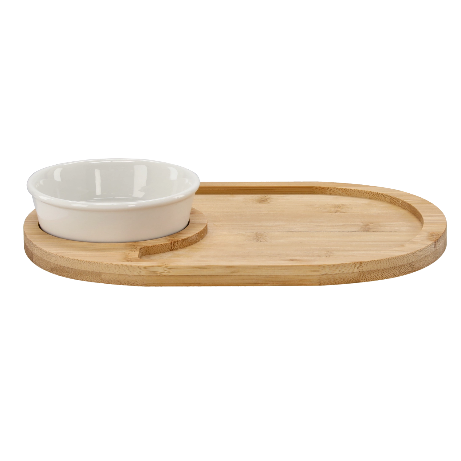Ten uniwersalny zestaw do serwowania przystawek zachwyca nowoczesnym, naturalnym wyglądem i funkcjonalnym wykonaniem. Owalna bambusowa taca z wydzielonym miejscem na porcelanową miseczkę umożliwia przejrzyste aranżowanie serów, wędlin, oliwek czy pieczywa, a jednocześnie podawanie sosów, dipów lub pesto. Dzięki wymiarom 28 × 21 × 4 cm oferuje dużo miejsca na rozmaite przekąski.