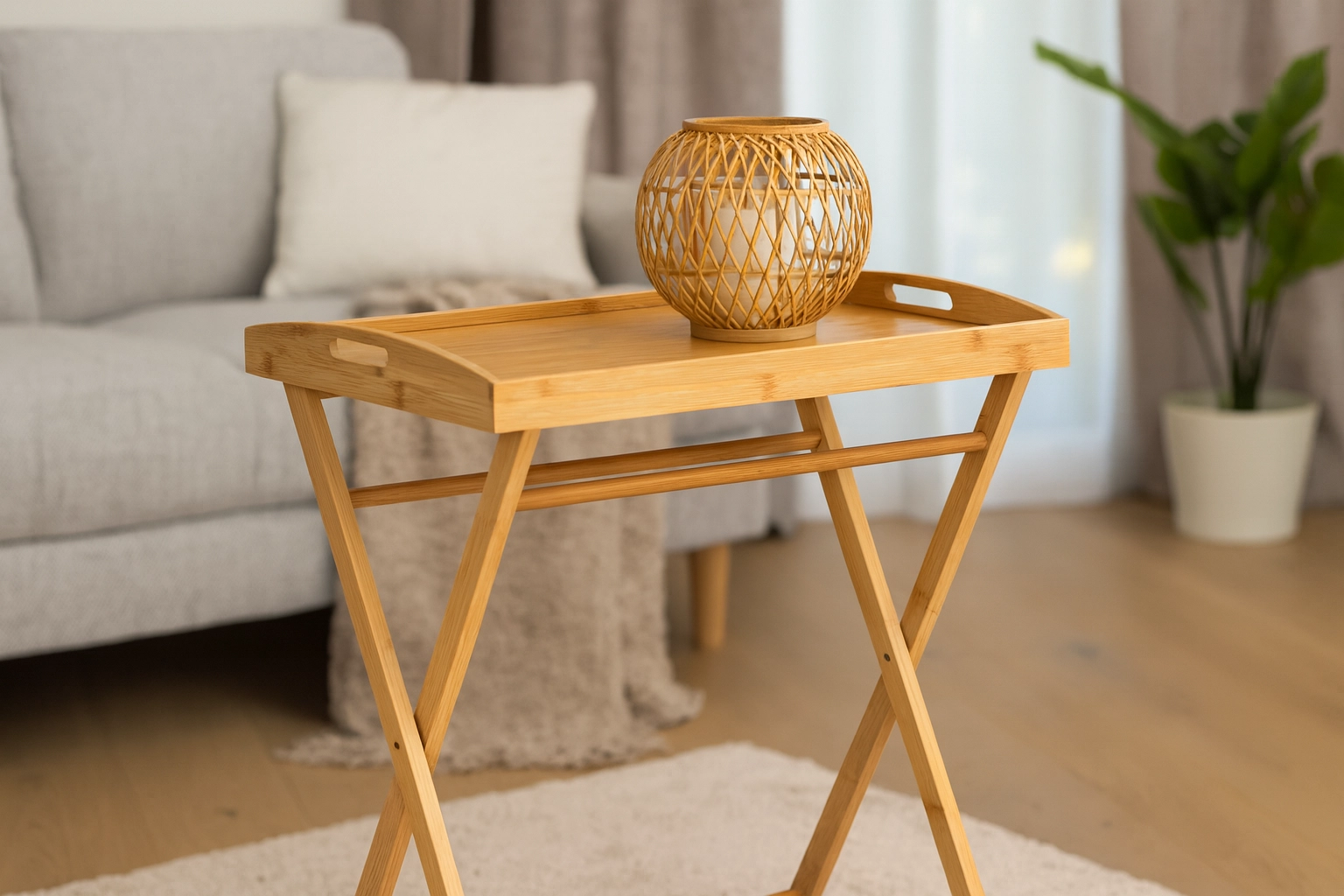 Stolik doskonale sprawdzi się jako taca śniadaniowa do łóżka, przenośny stolik kawowy przy sofie oraz podstawka do pracy z laptopem. Naturalny bambus w delikatnym, jasnym odcieniu jest łatwy w pielęgnacji, lekki i przyjazny dla środowiska – perfekcyjny wybór do nowoczesnych i skandynawskich wnętrz.