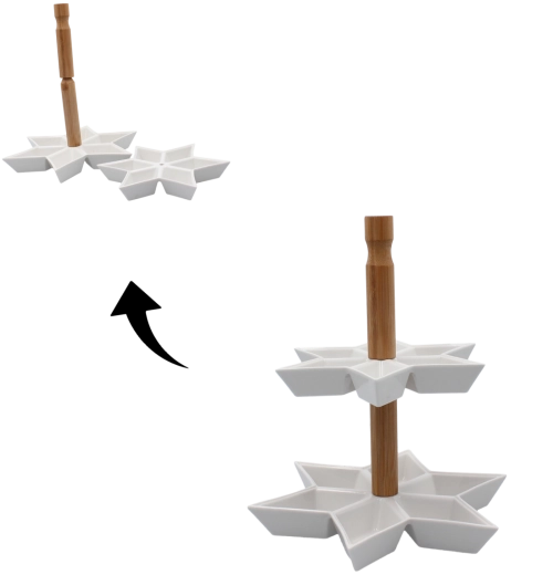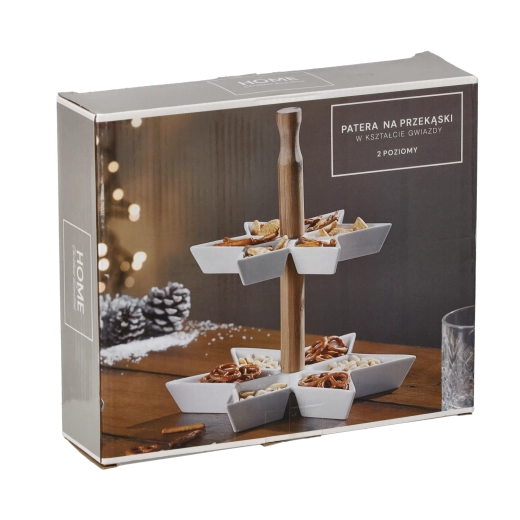 Ten stojak do serwowania jest idealny na desery, owoce, ciasteczka, orzeszki czy tapas. Nowoczesny, gwiazdowy kształt przyciąga wzrok i pasuje do każdego wnętrza – od rodzinnych uroczystości po świąteczne biesiadowanie.