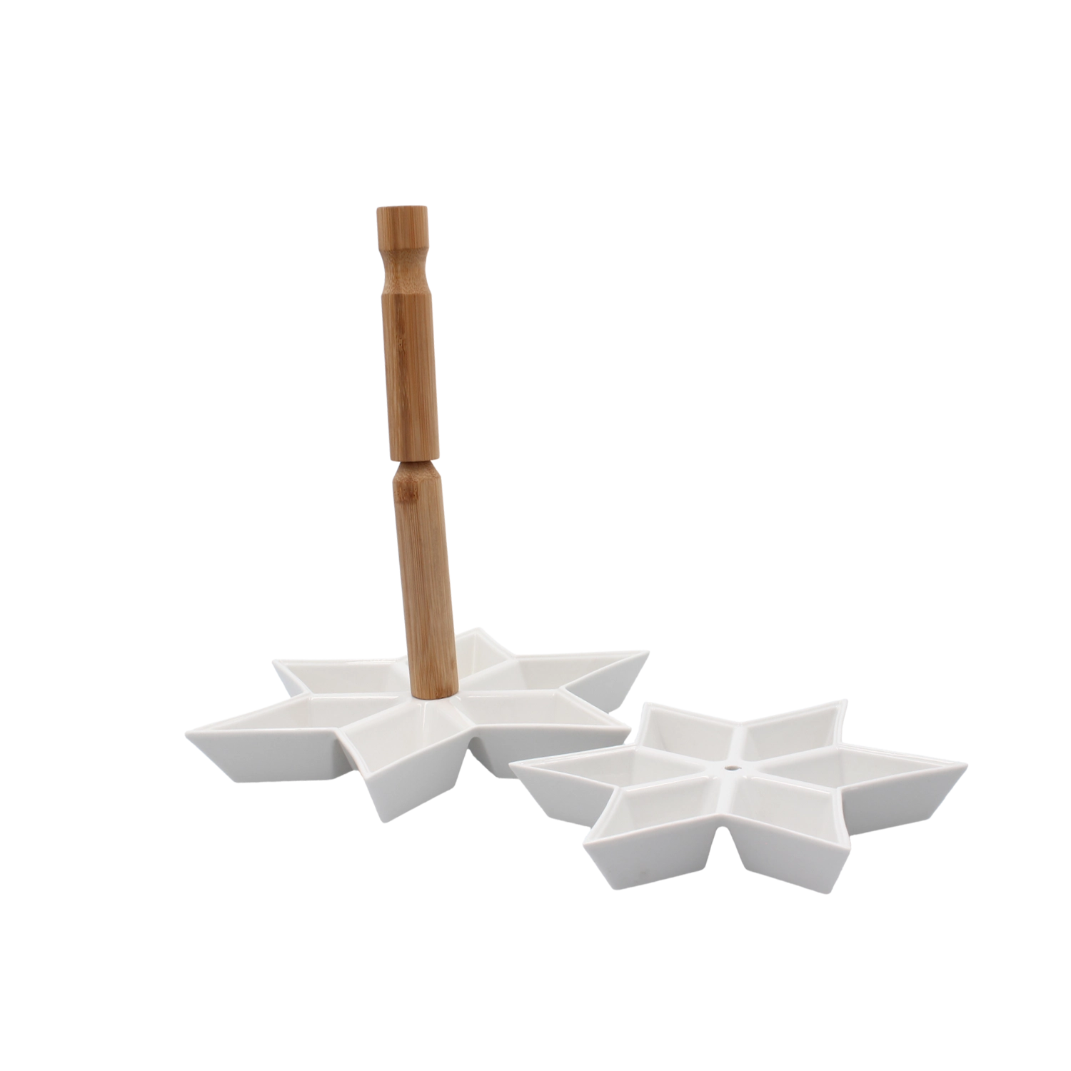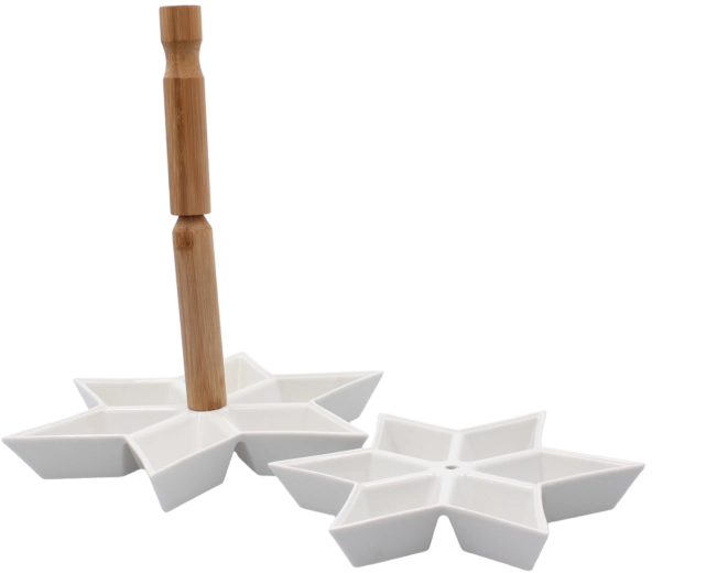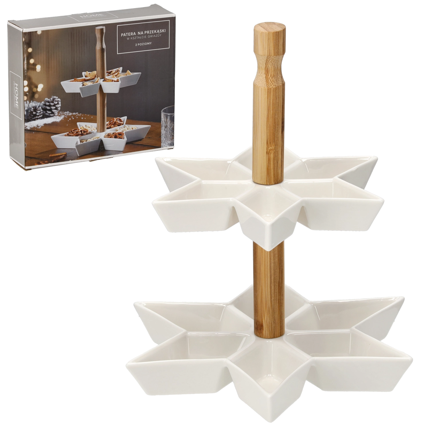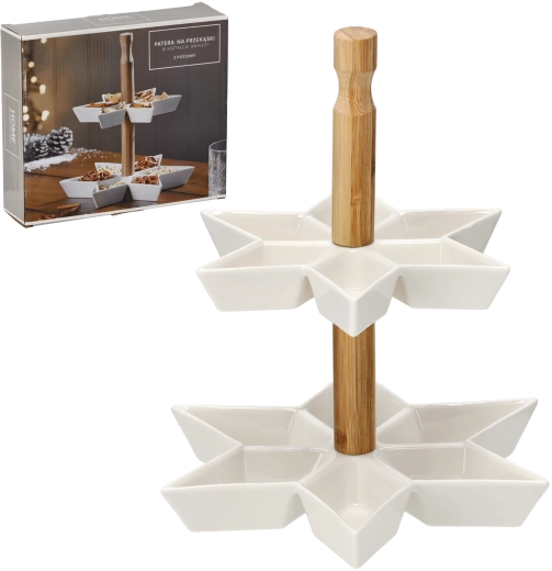 Stwórz efektowną prezentację przekąsek z dwupoziomowym etażerem w kształcie gwiazdy. Biała ceramika o gładkiej powierzchni wygląda czysto i elegancko, a bambusowy uchwyt zapewnia bezpieczne i wygodne przenoszenie. Dzięki dwóm poziomom łatwo oddzielisz różne rodzaje smakołyków, a jednocześnie zaoszczędzisz cenne miejsce na stole.