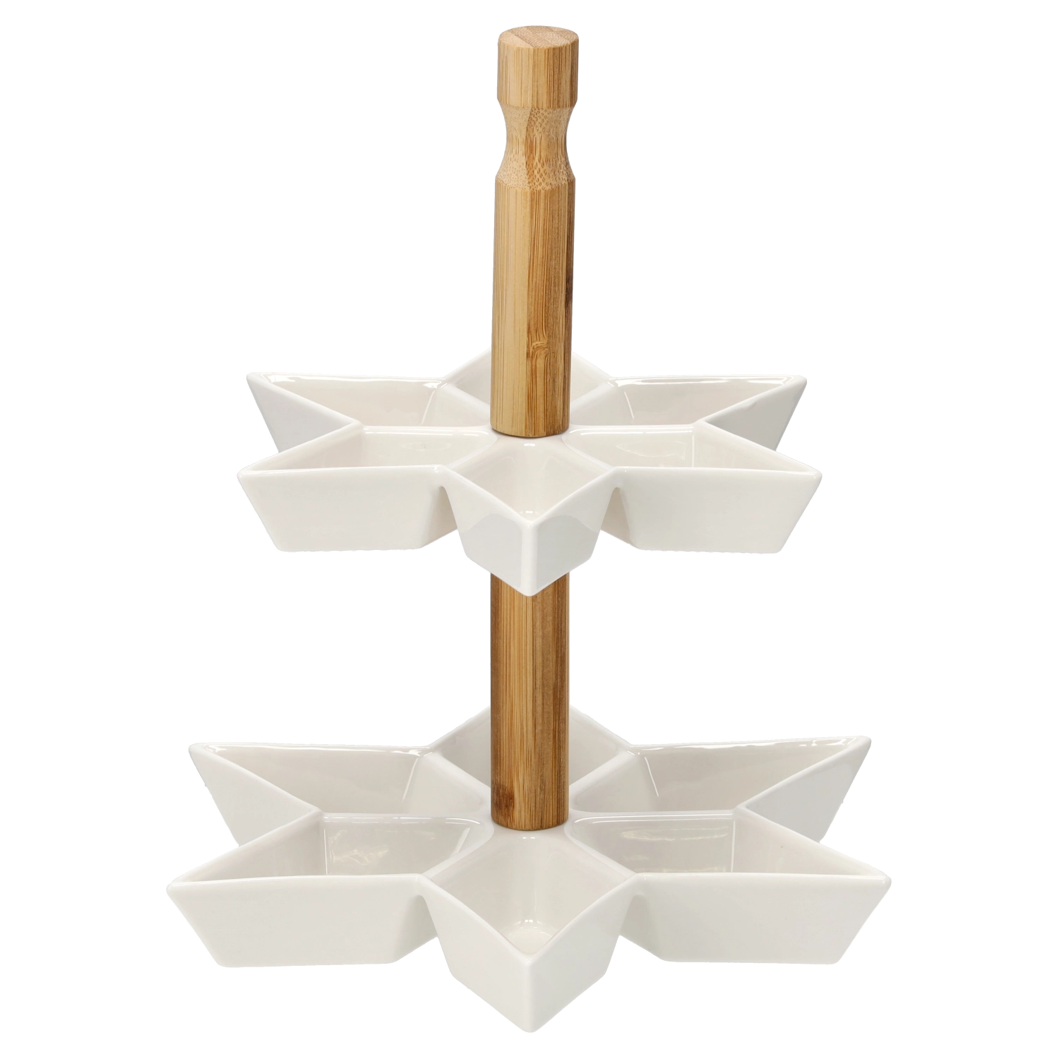 Elegancki, dwupoziomowy etażer w kształcie gwiazdy z białej ceramiki z naturalnym bambusowym uchwytem jest idealny do serwowania deserów, owoców, ciastek i przekąsek. Dwupoziomowa konstrukcja oszczędza miejsce na stole, gładka powierzchnia ułatwia czyszczenie, a stylowy design doda uroku każdej uroczystej aranżacji stołu i spotkaniu z przyjaciółmi.