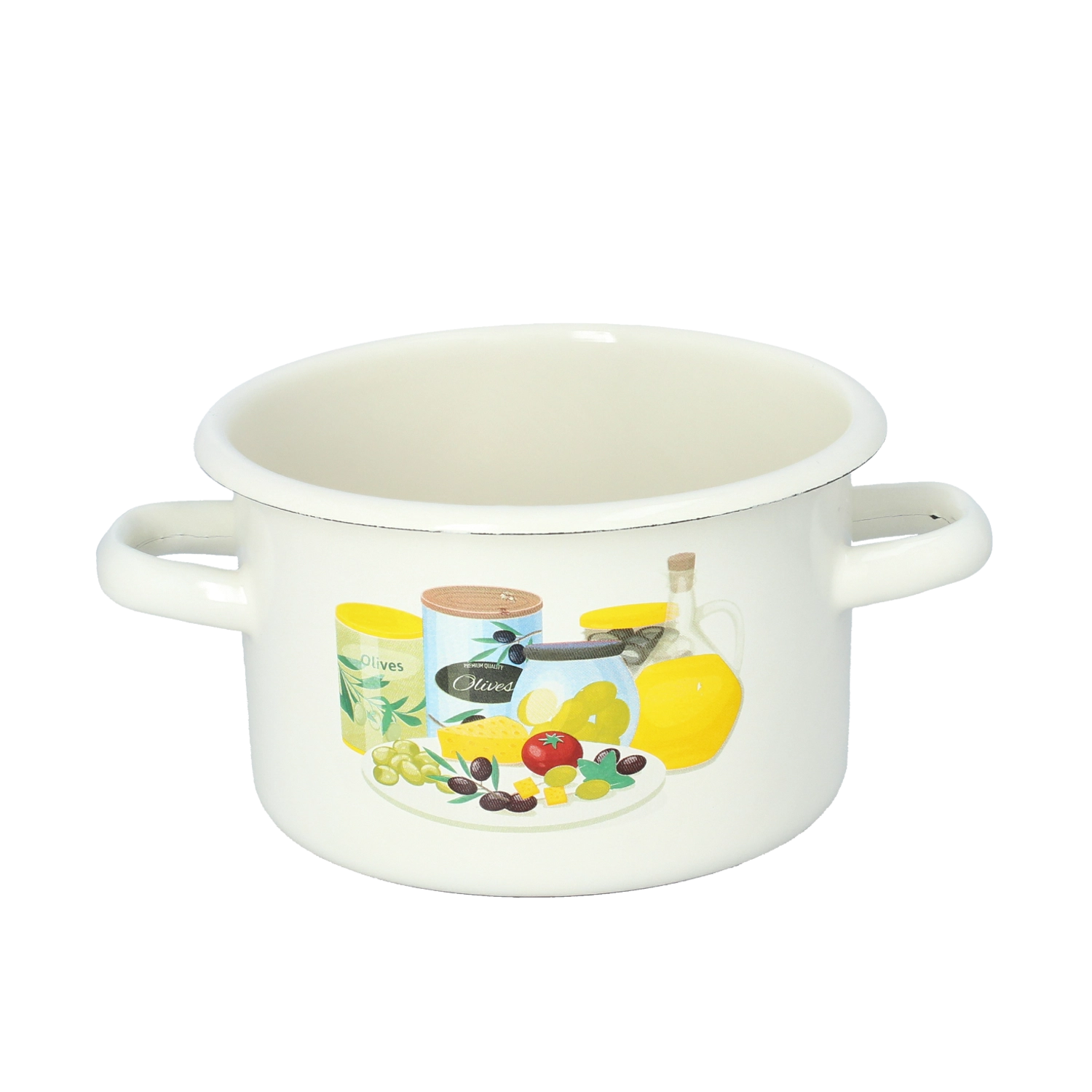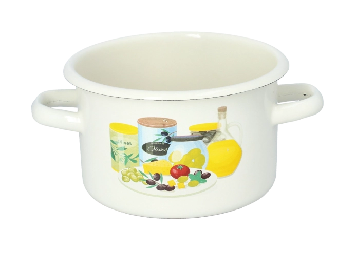 Odkryj wszechstronny emaliowany garnek o pojemności 2 litrów, który doskonale sprawdzi się do przygotowywania zup, sosów czy podgrzewania mniejszych porcji. Wysokiej jakości emaliowana powłoka jest higieniczna, łatwa w czyszczeniu i odporna na zarysowania. Kremowe wykończenie z motywem oliwek doda Twojej kuchni stylu i świeżości.