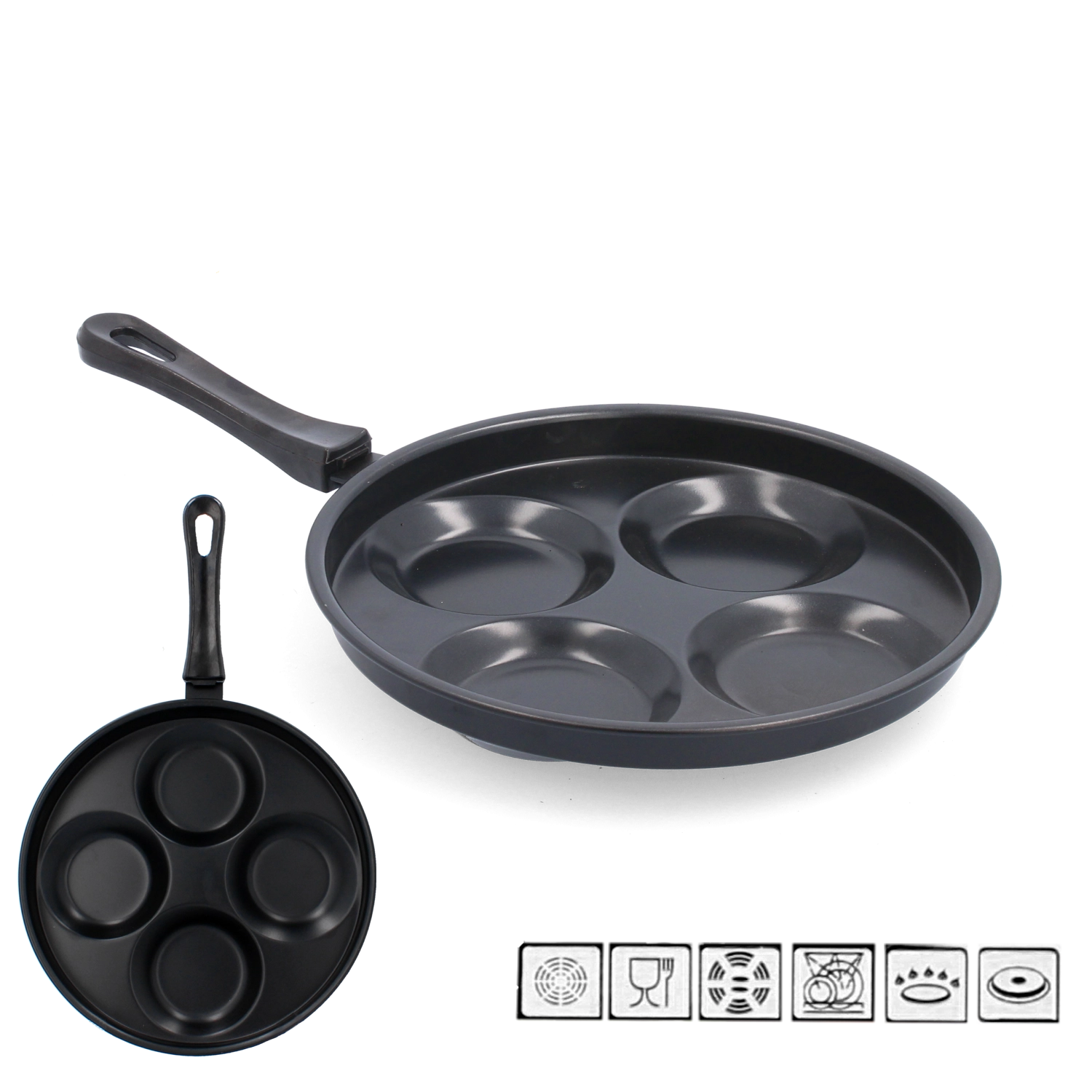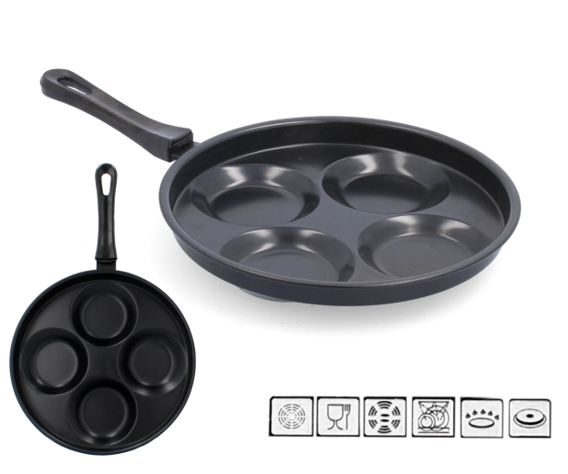Praktyczna patelnia do jajek o średnicy 24 cm z wytrzymałej stali węglowej z nieprzywierającą powłoką, która ułatwia smażenie bez przypalania. Ergonomiczny plastikowy uchwyt zapewnia wygodne i bezpieczne trzymanie, a zewnętrzna, odporna na wysoką temperaturę powłoka zwiększa trwałość podczas codziennego użytkowania.
