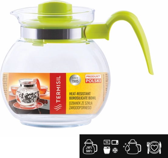 Uniwersalny dzbanek z borokrzemowego szkła o pojemności 1,5 l do gorących i zimnych napojów. Wytrzymuje temperatury od -50 °C do +500 °C, jest chemicznie obojętny i nie wpływa na smak napojów. Posiada plastikową pokrywkę i uchwyt (kolor wysyłany losowo), można go myć w zmywarce, używać w kuchence mikrofalowej oraz bezpiecznie przechowywać w lodówce.