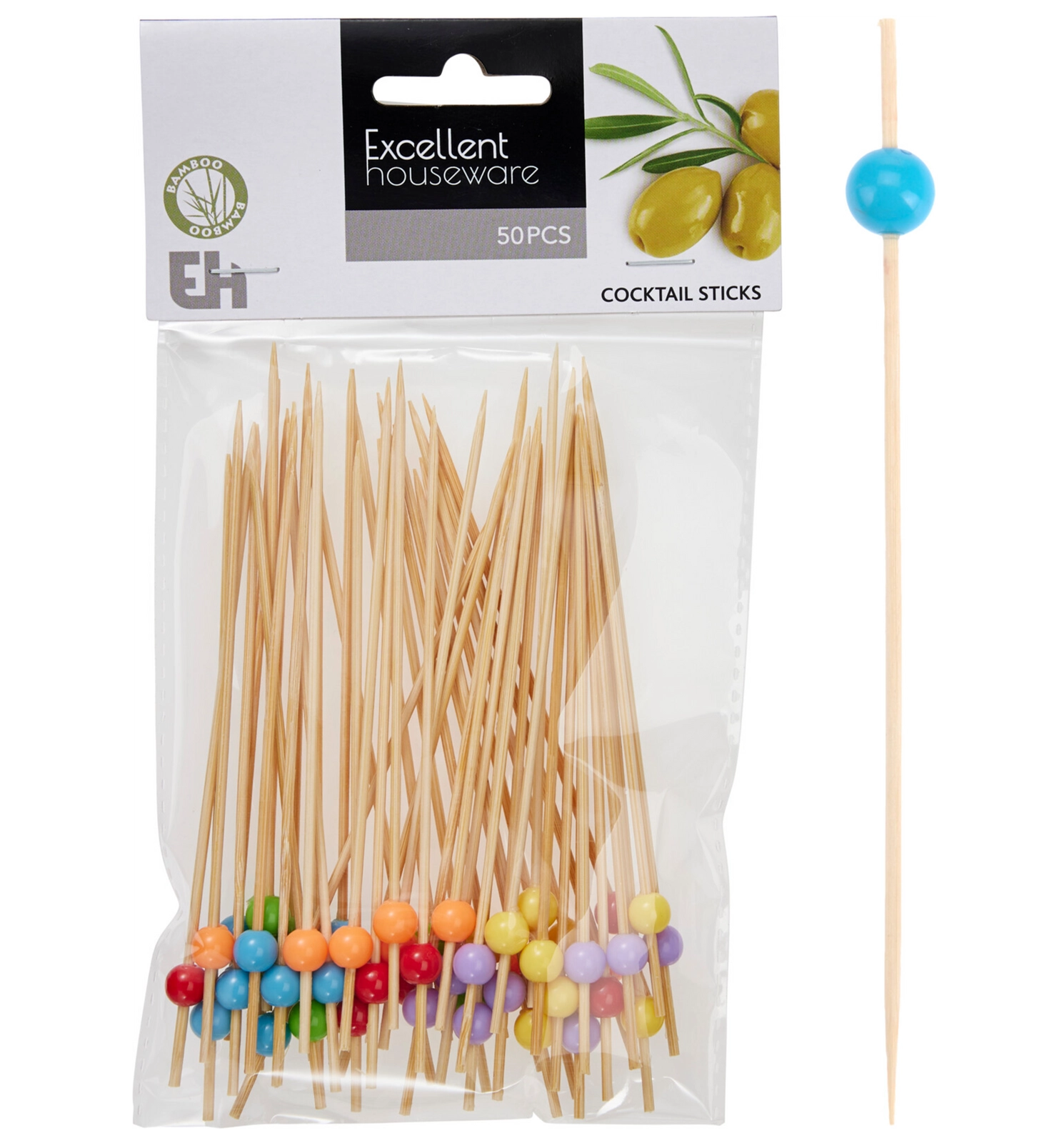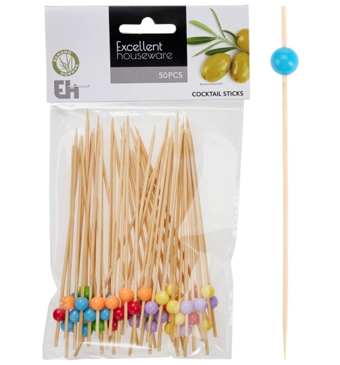 Bambusowe wykałaczki koktajlowe z kolorowymi kuleczkami 8 cm, 50 szt.