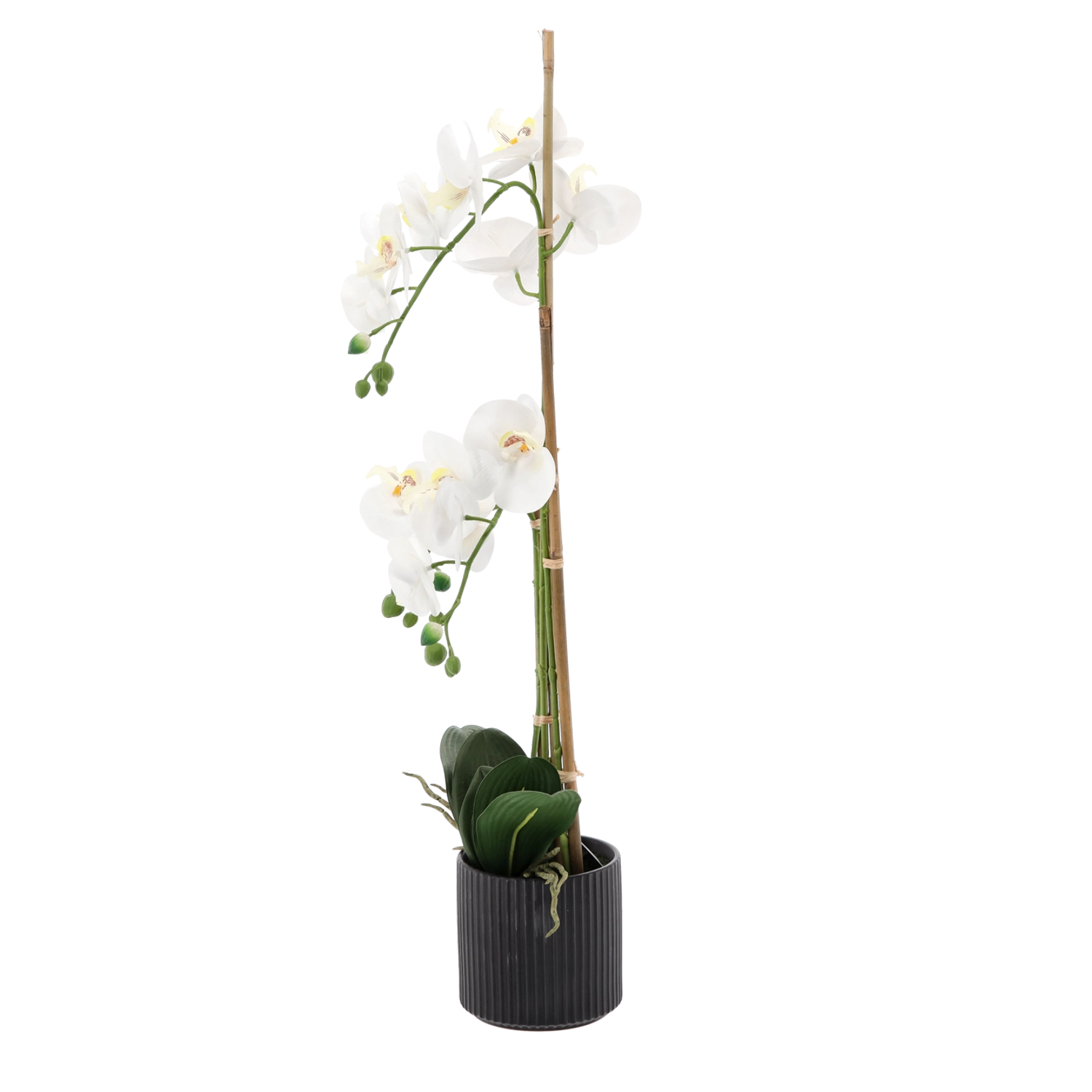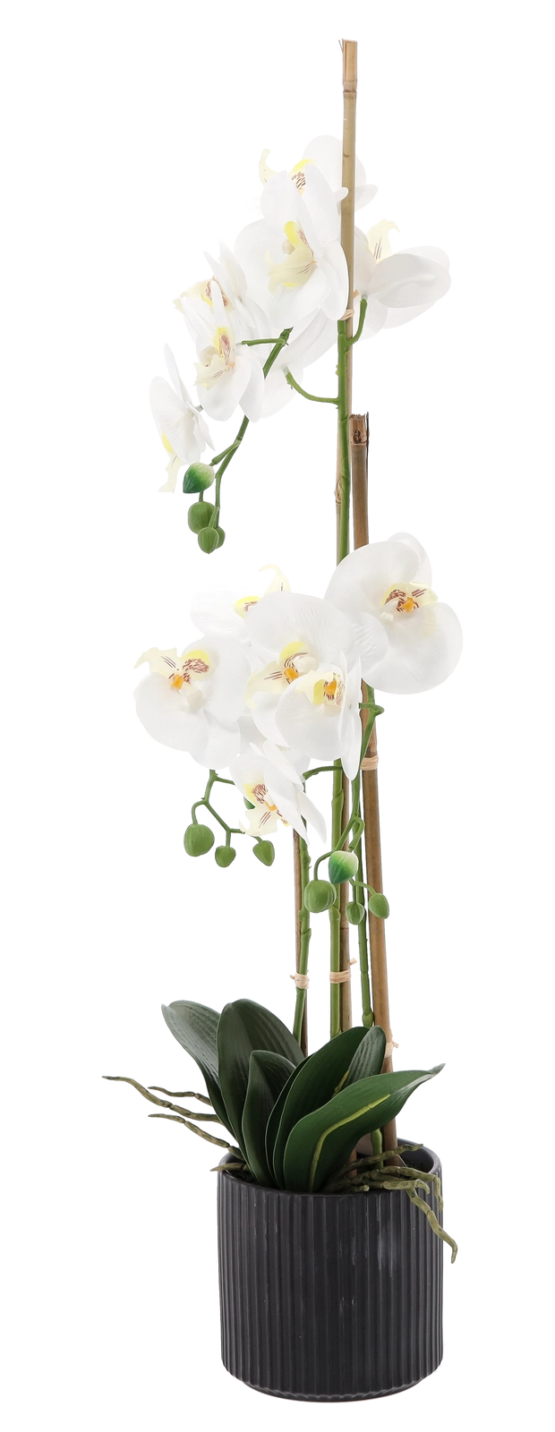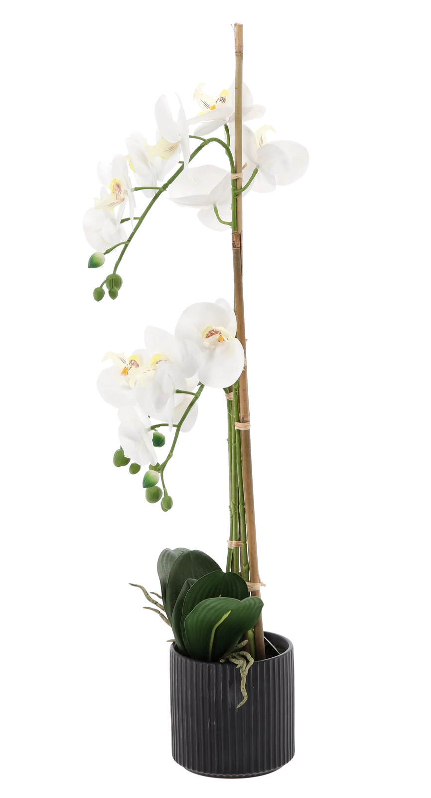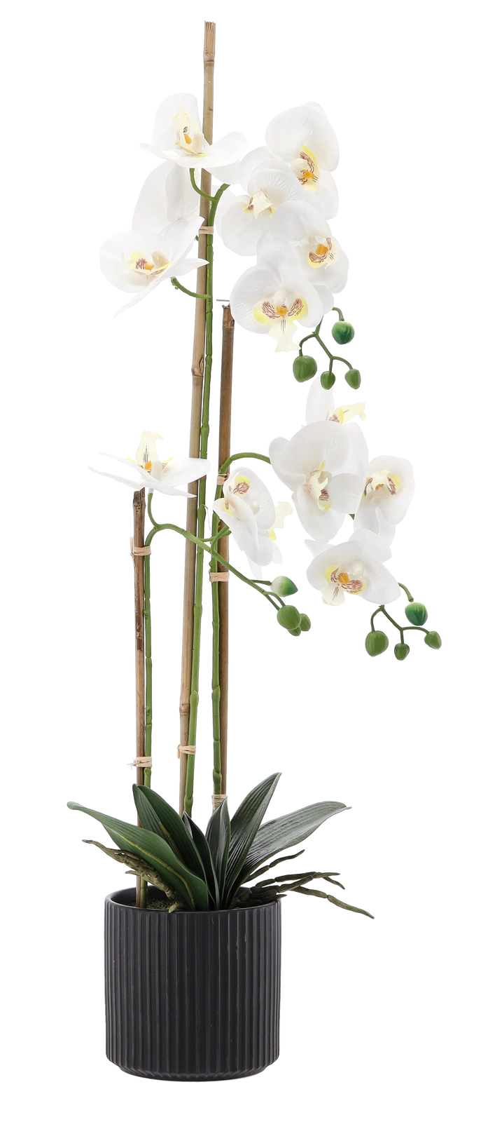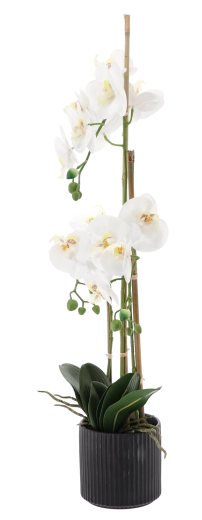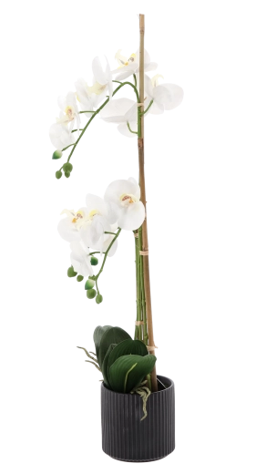 Ta designerska sztuczna orchidea ma wysokość 77 cm i jest osadzona w stonowanej czarnej żebrowanej doniczce, która podkreśla jej elegancki wygląd. Dzięki wiernie odwzorowanym kwiatom, pąkom i lśniącym liściom wnosi do przestrzeni naturalny klimat bez koniecznej konserwacji.