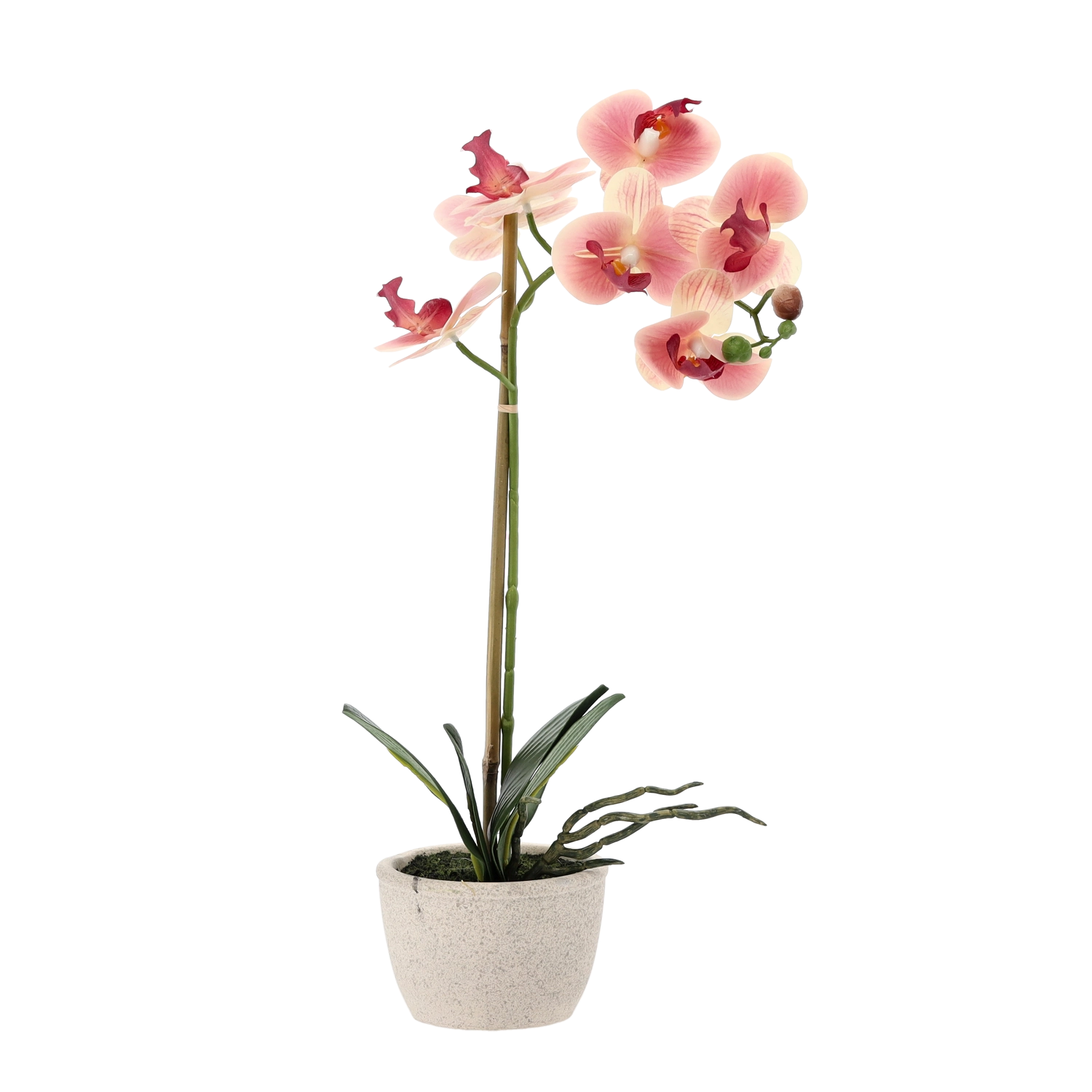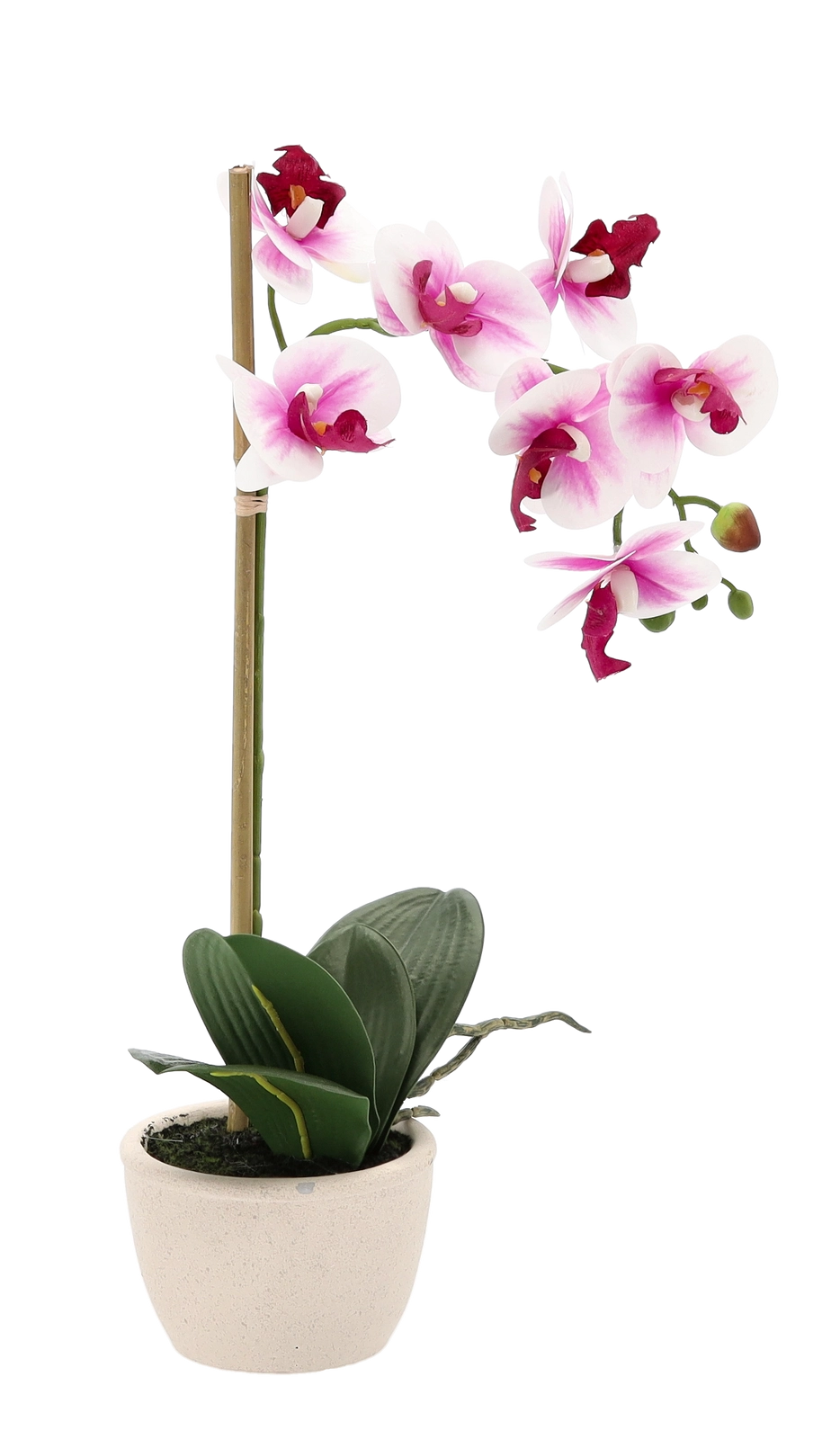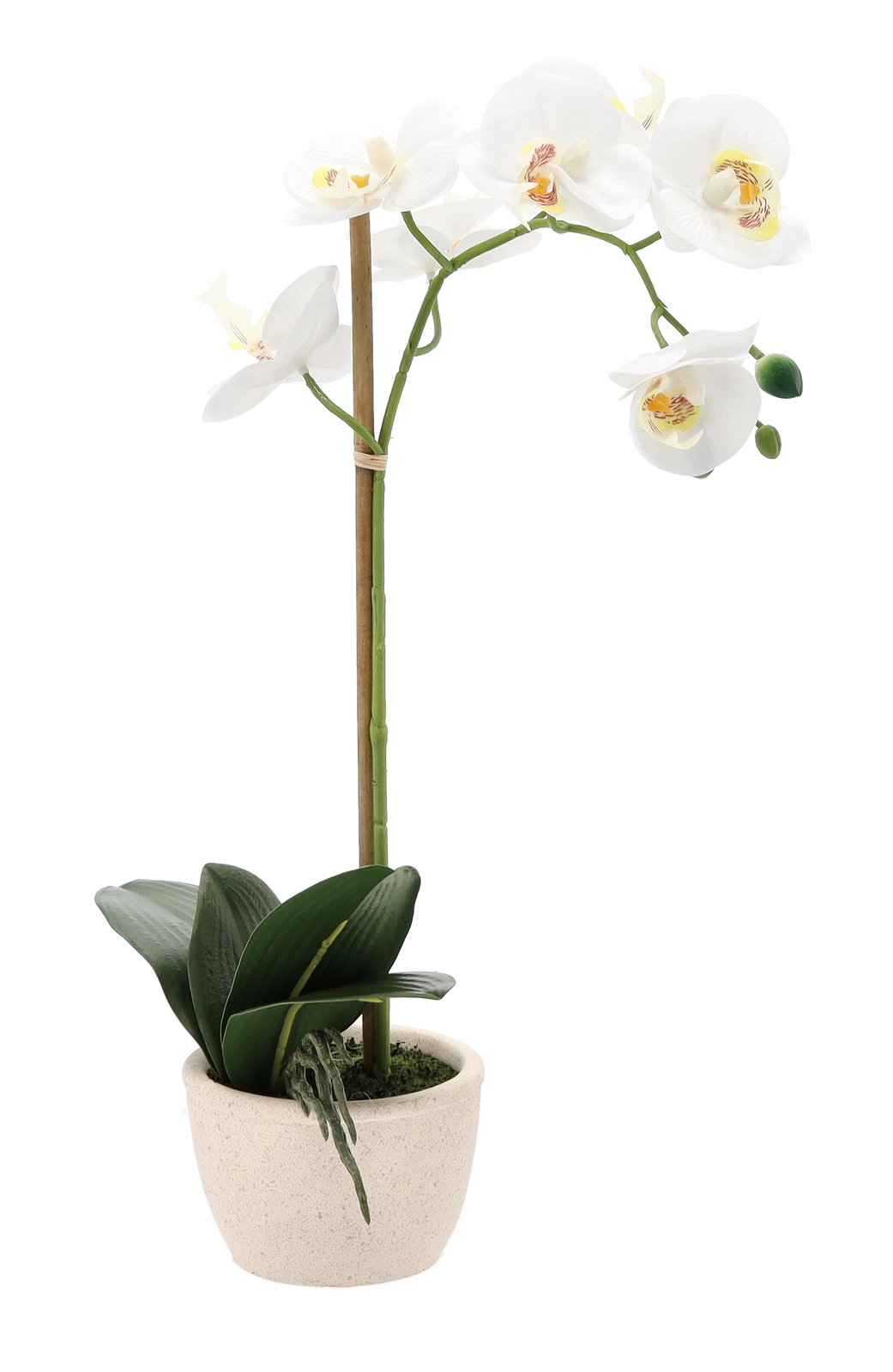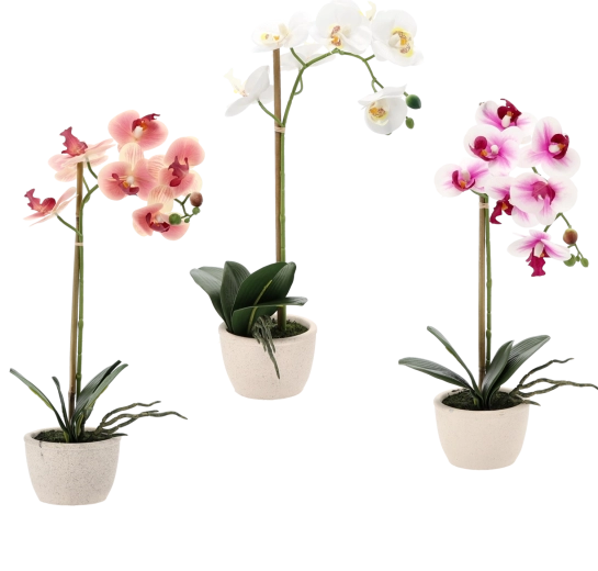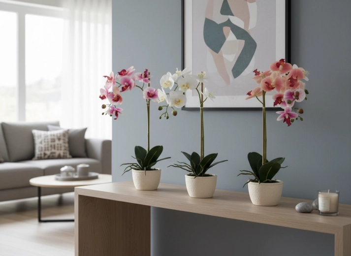 Delikatne płatki, dekoracyjne pąki i soczyste liście wiernie odwzorowują żywą orchideę, dodając wnętrzu luksusowego wyglądu bez wysiłku.