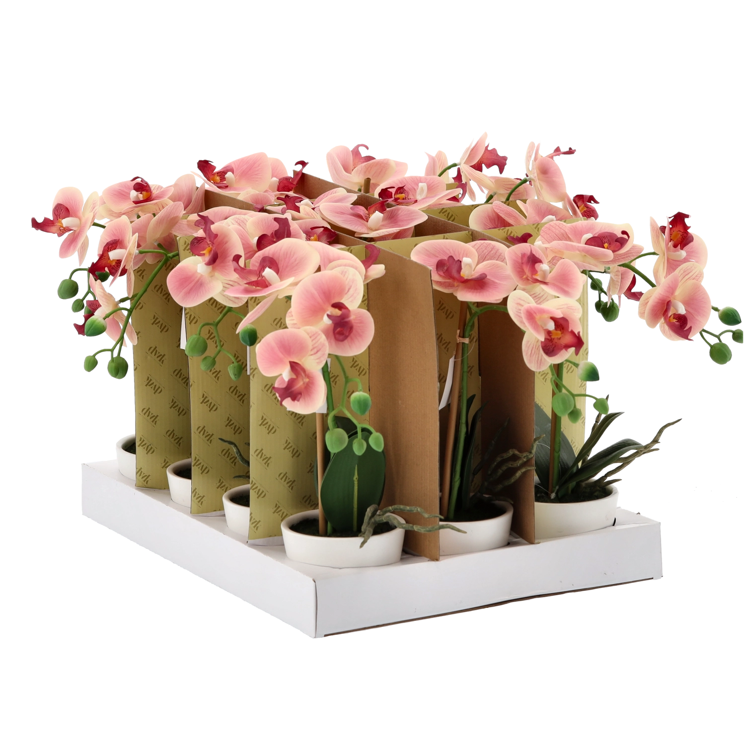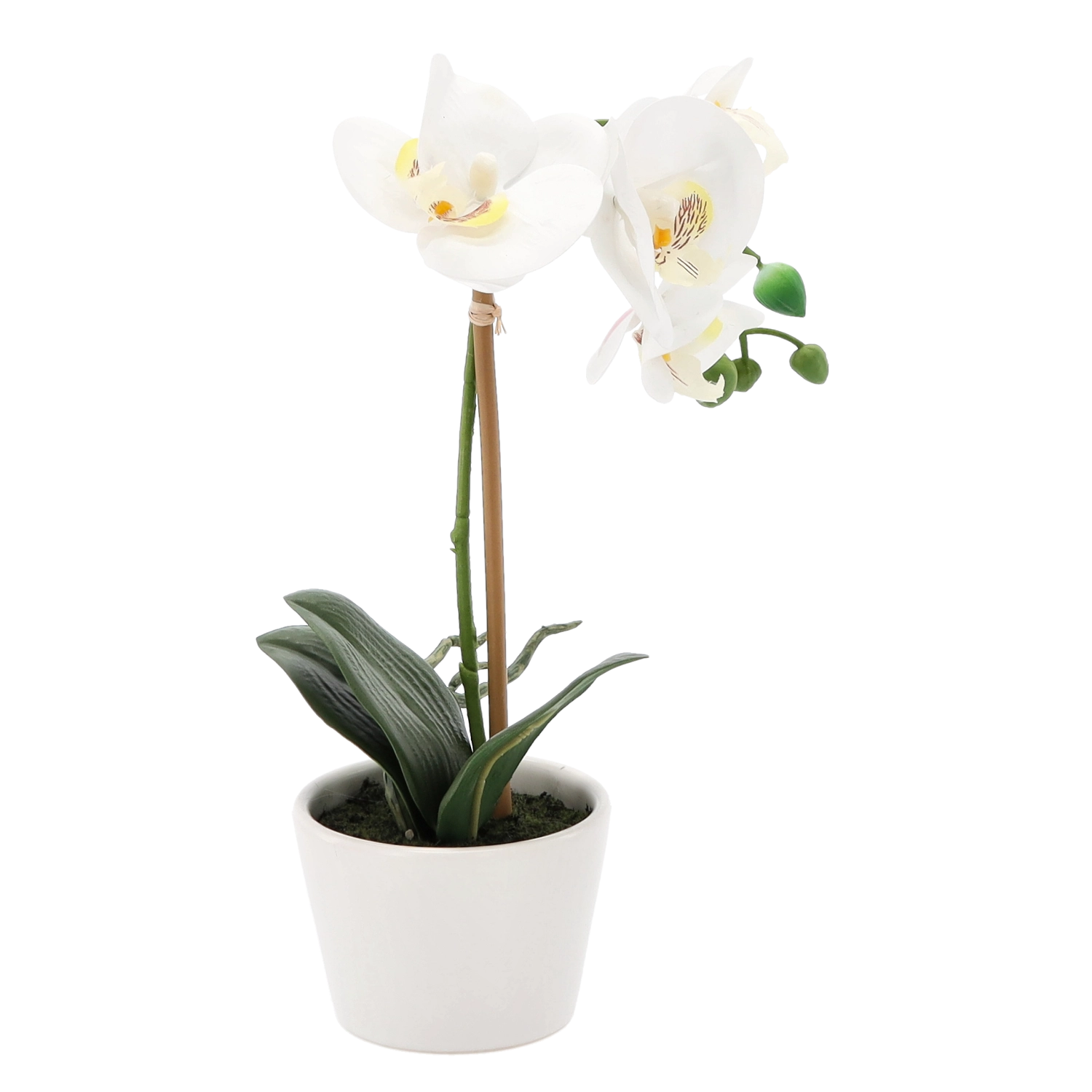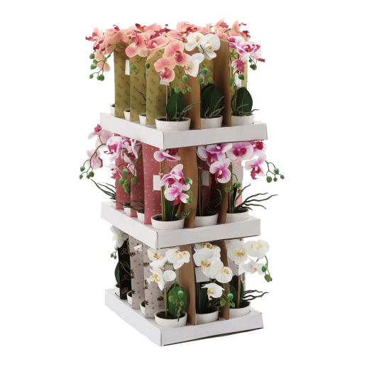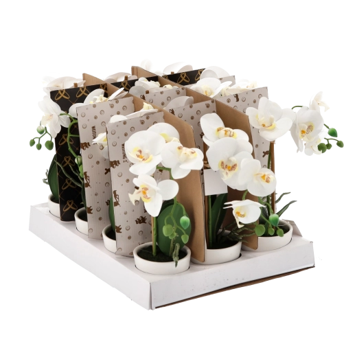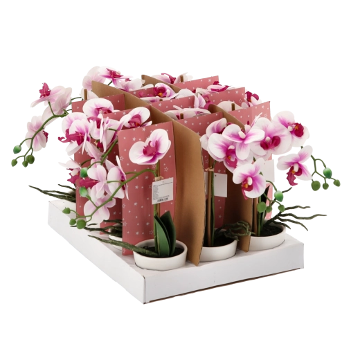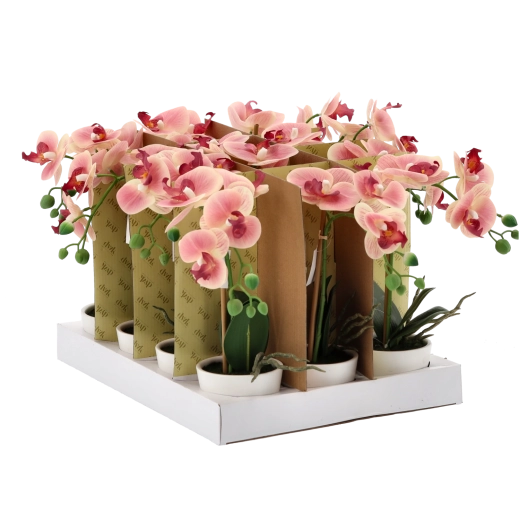 Starannie odwzorowane kwiaty, pąki i liście tworzą naturalny wygląd orchidei, która zachowuje piękno przez cały rok bez podlewania i specjalnej pielęgnacji.