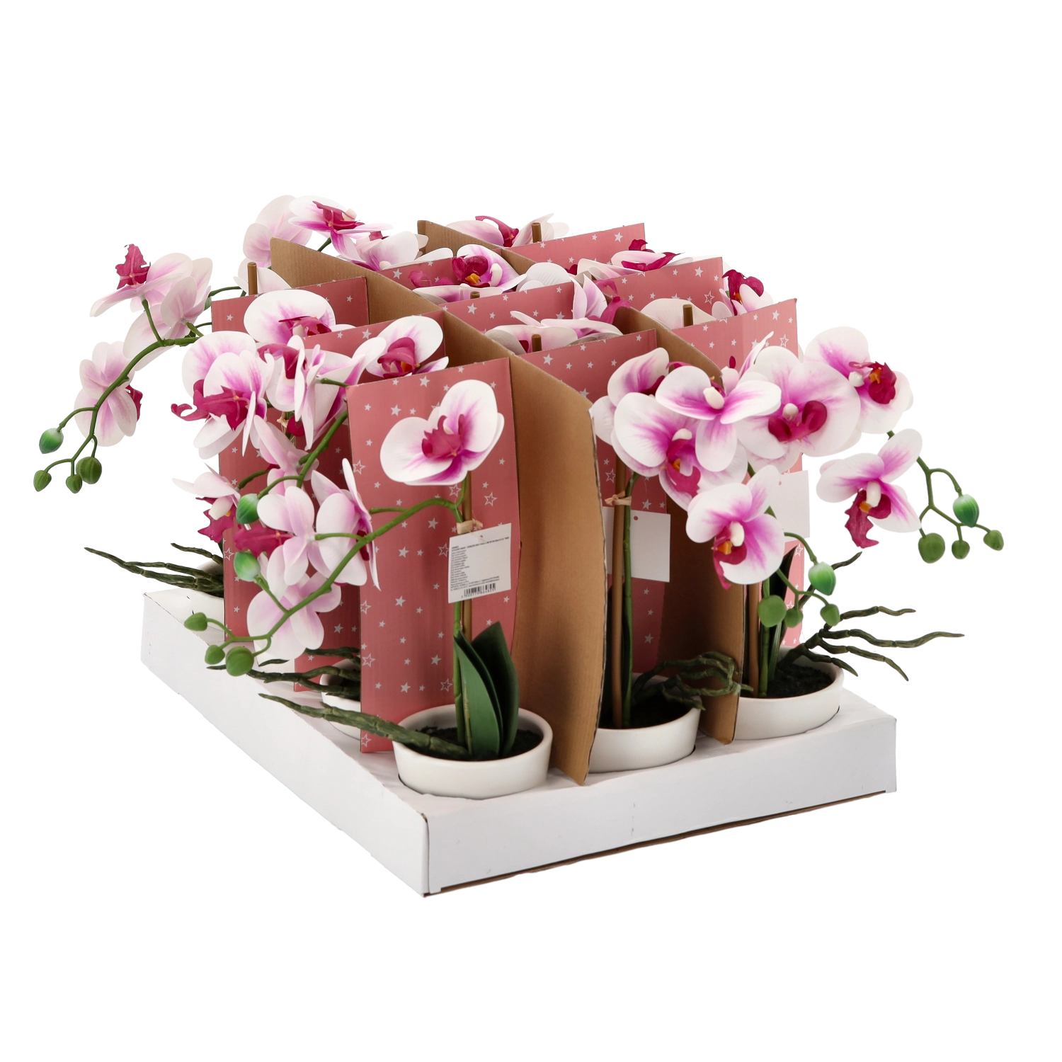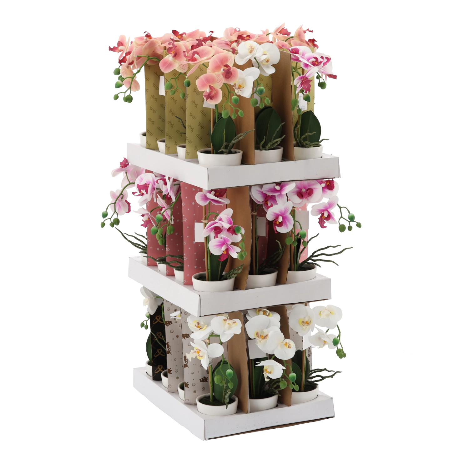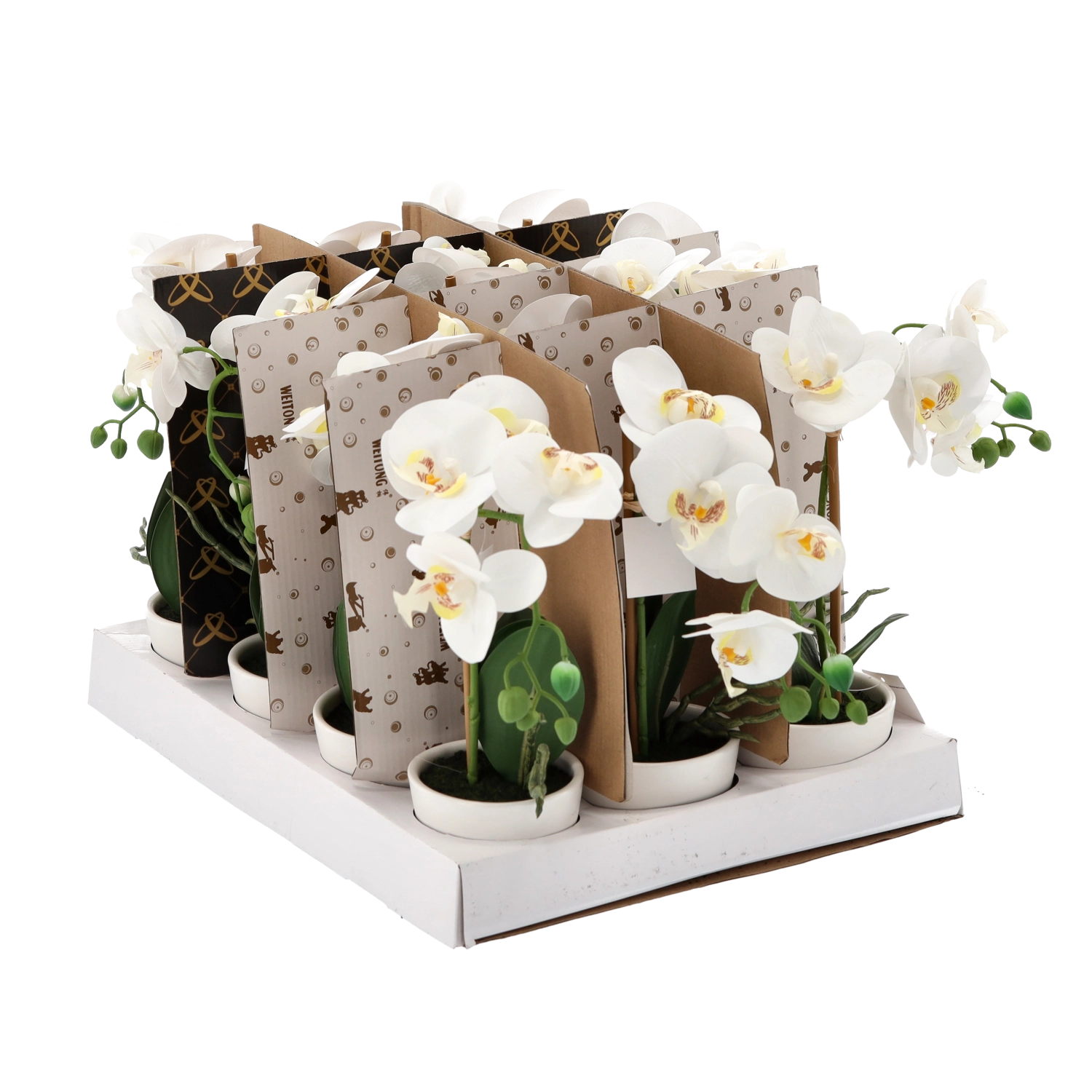 Starannie odwzorowane kwiaty, pąki i liście tworzą naturalny wygląd orchidei, która zachowuje piękno przez cały rok bez podlewania i specjalnej pielęgnacji.