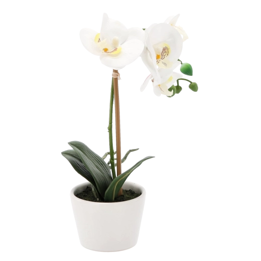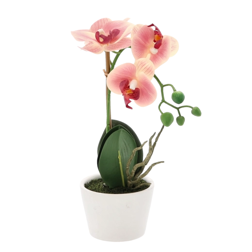 Sztuczna orchidea w doniczce wnosi elegancję prawdziwych kwiatów bez trosk związanych z pielęgnacją. Realistyczne kwiaty, pąki i liście wyglądają naturalnie i dodają każdemu pomieszczeniu subtelnego koloru oraz harmonii. Dzięki kompaktowej wysokości 30 cm sprawdzi się na stole, półce i parapecie.
