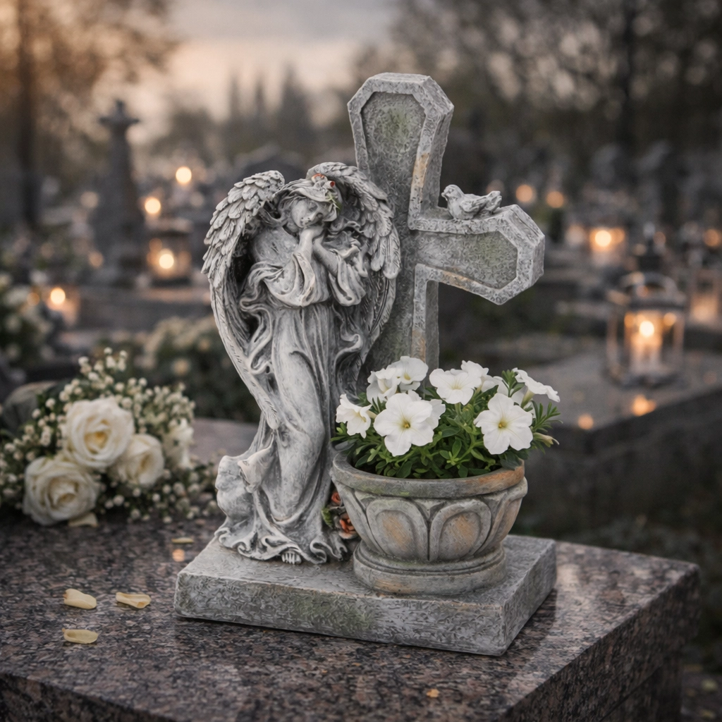 Elegancka figurka anioła z krzyżem i doniczką wnosi do przestrzeni duchową symbolikę i szacunek dla pamięci. Doskonale sprawdzi się na cmentarzu i w ogrodzie, łącząc wzniosły design z praktyczną możliwością umieszczenia kwiatów.