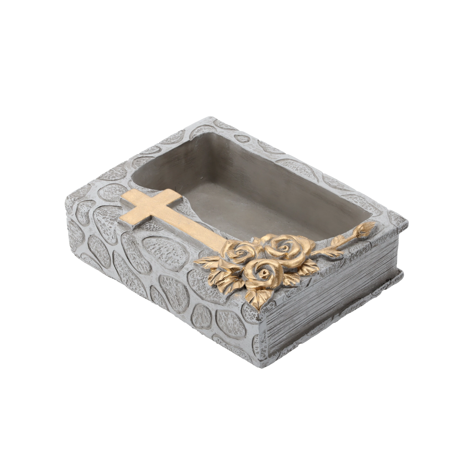 Ta cementowa osłonka w formie książki to świetny wybór do tworzenia trwałych i gustownych dekoracji pamięci. Szara powierzchnia z delikatnymi złotymi akcentami podkreśla symbolikę pamięci i łatwo komponuje się z kwiatami naturalnymi i sztucznymi.