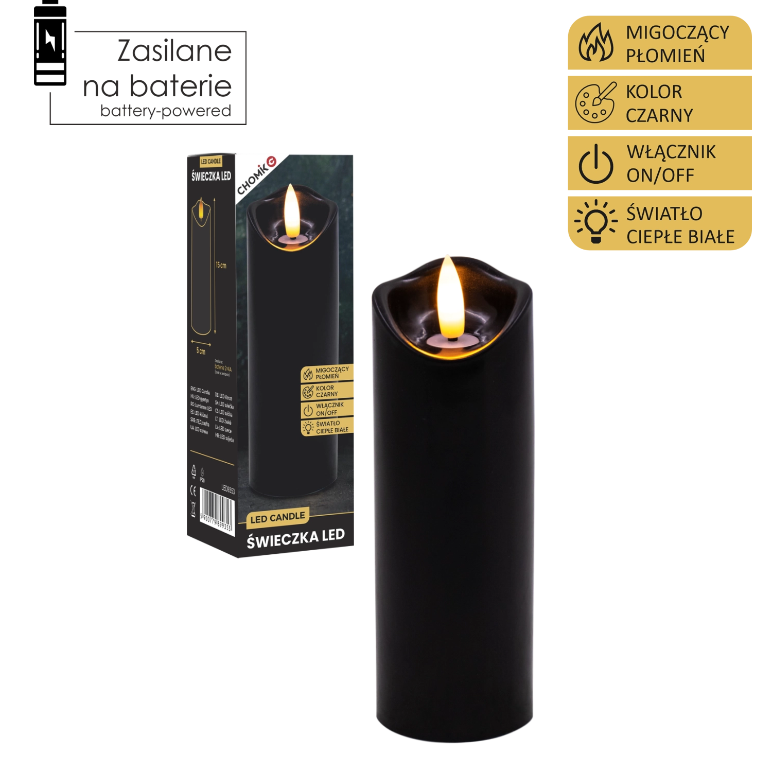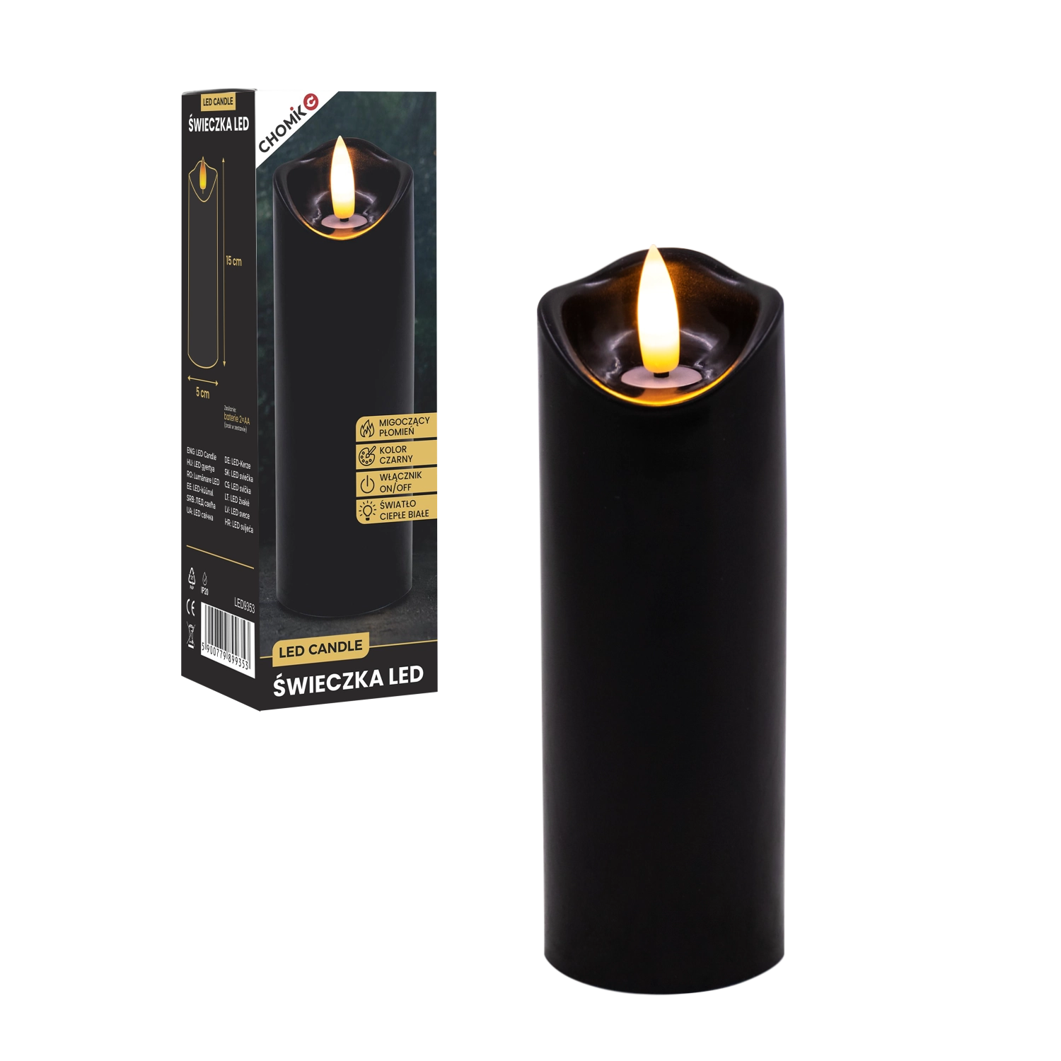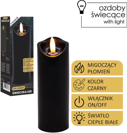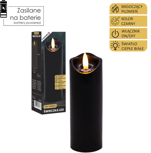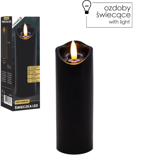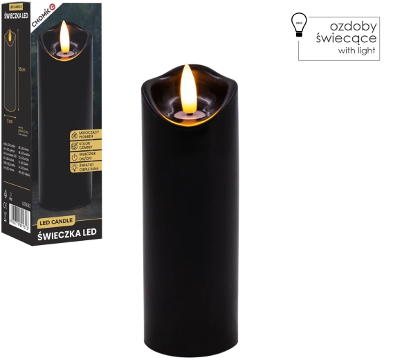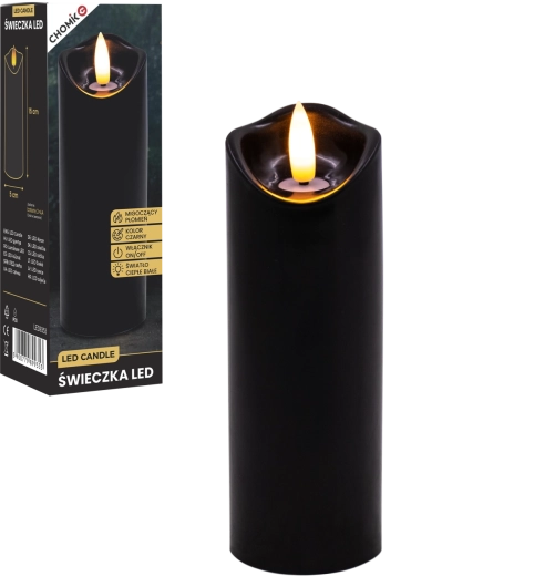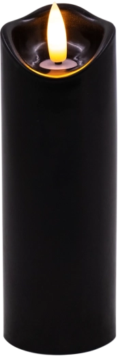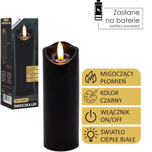 Stylowa czarna LED świeca z realistycznym, delikatnie migoczącym ciepłym białym światłem. Idealna jako dekoracja do wnętrz oraz jako wkład do latarni lub świecznika. Praktyczne zasilanie 2× AA (baterie nie są dołączone) i proste sterowanie On/Off.
