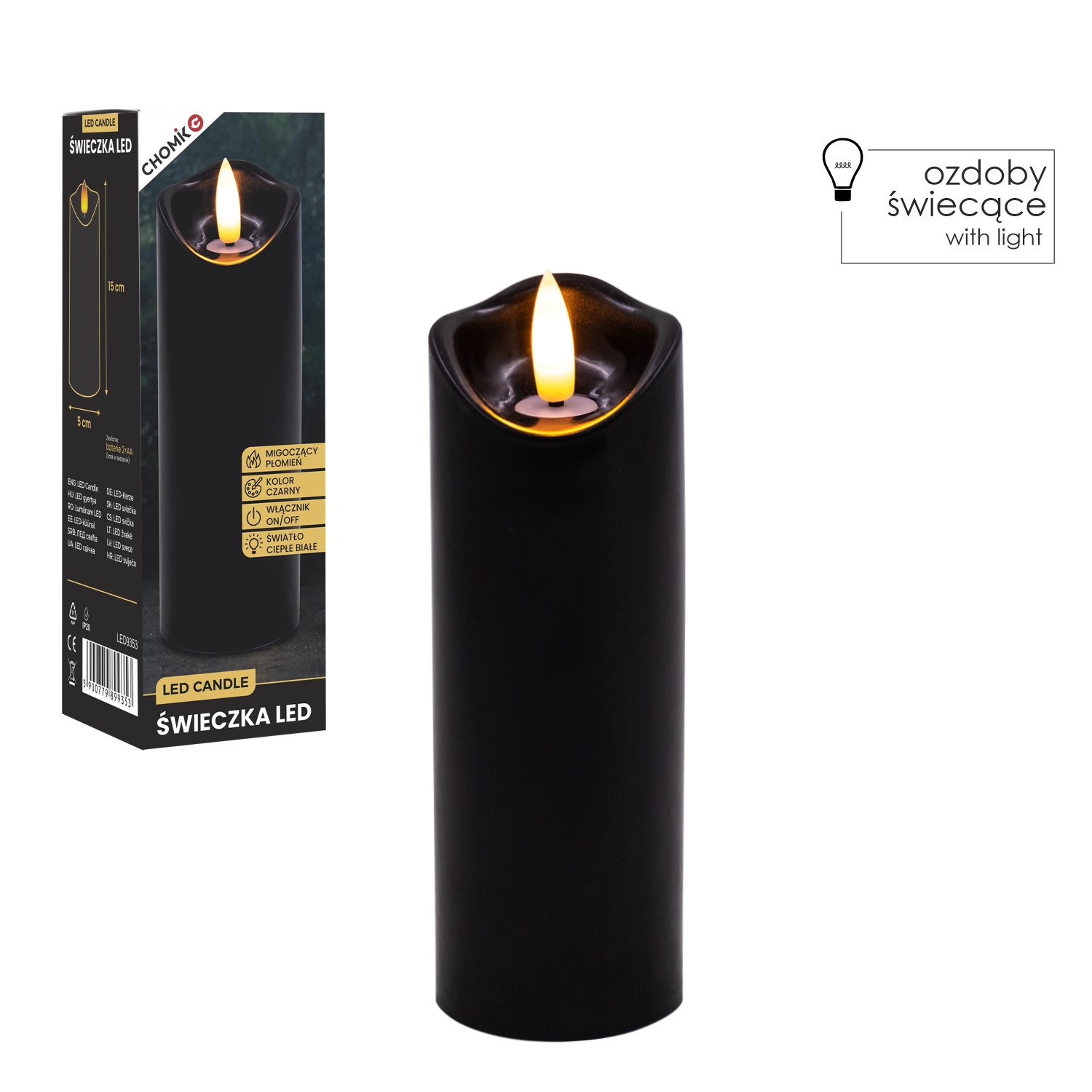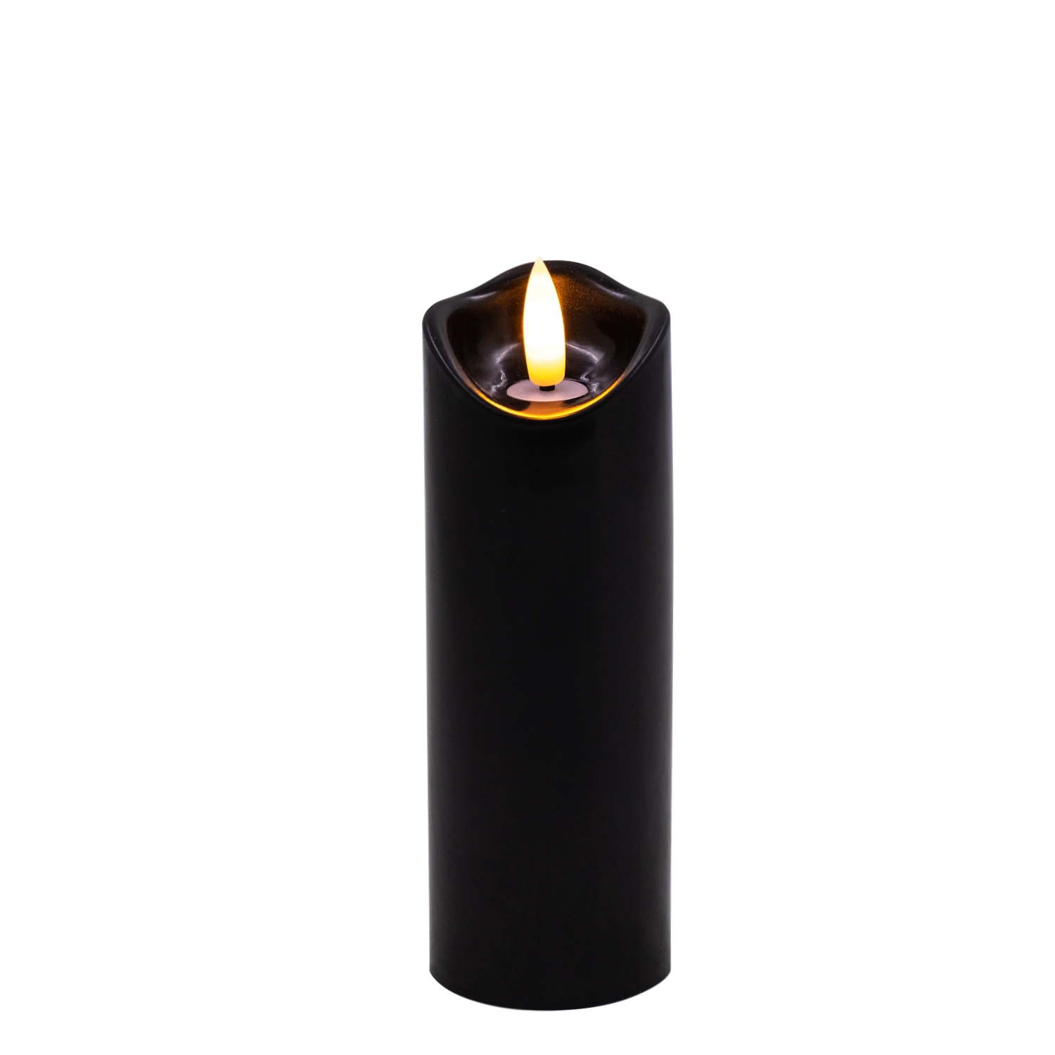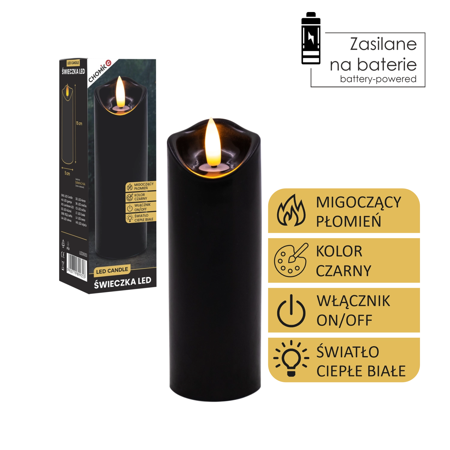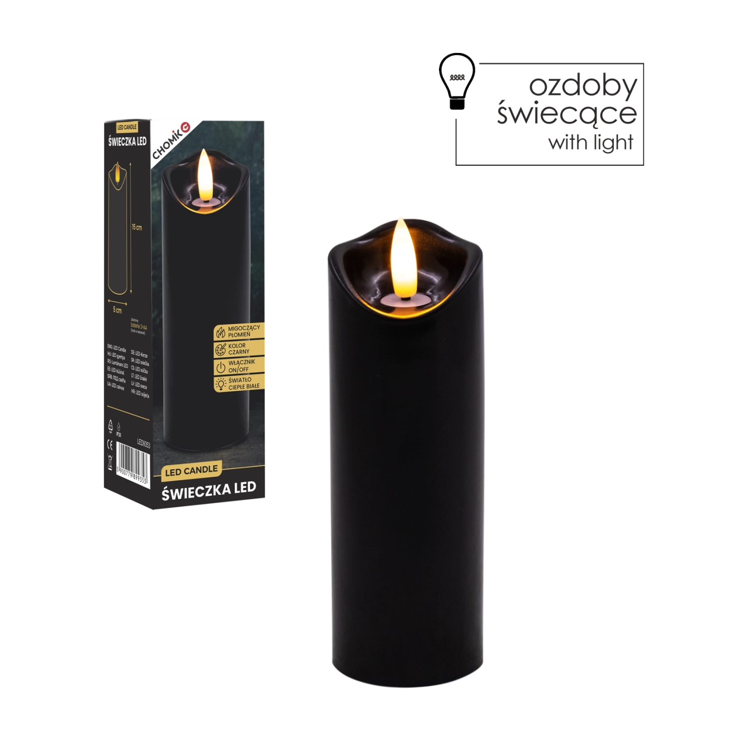 Stylowa czarna LED świeca z realistycznym, delikatnie migoczącym ciepłym białym światłem. Idealna jako dekoracja do wnętrz oraz jako wkład do latarni lub świecznika. Praktyczne zasilanie 2× AA (baterie nie są dołączone) i proste sterowanie On/Off.