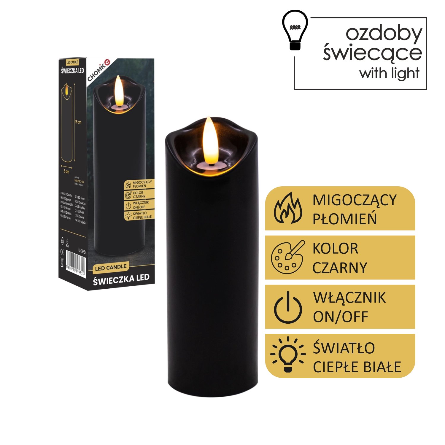 - Realistyczny efekt płomienia: delikatne migotanie w ciepłej bieli